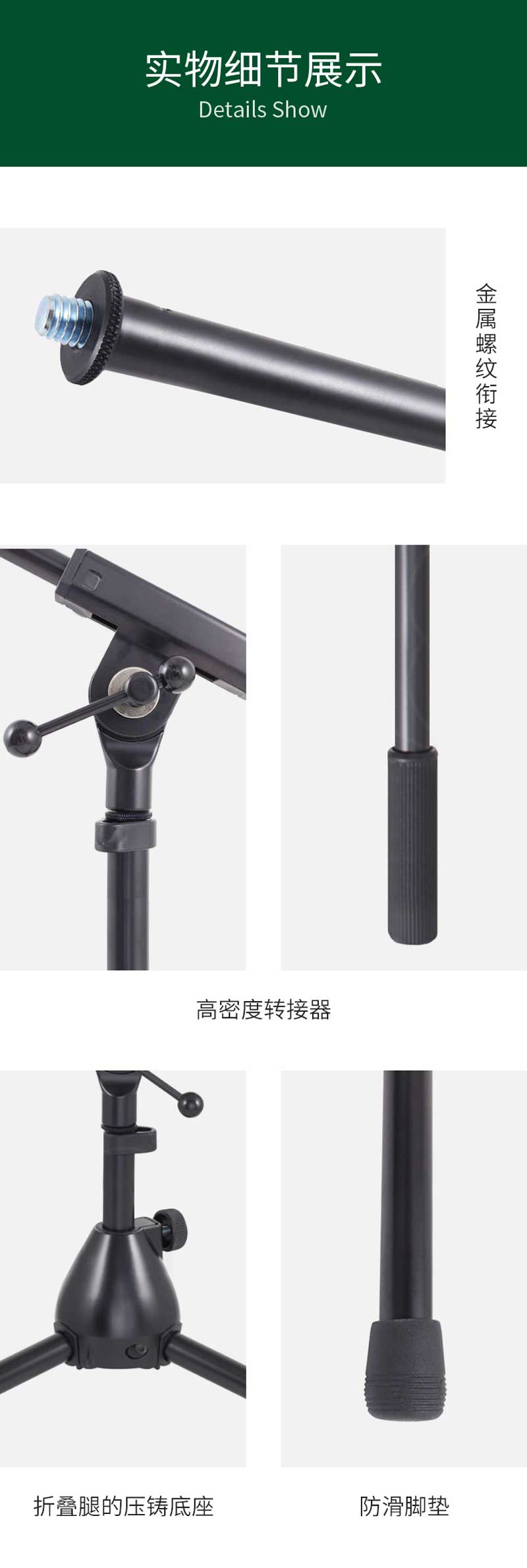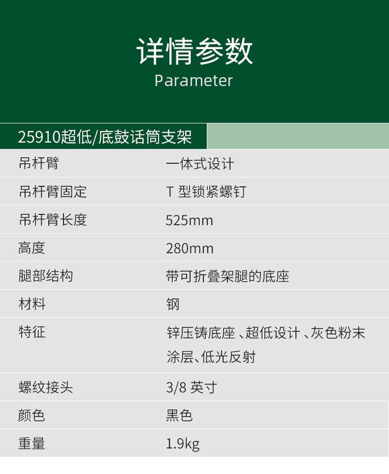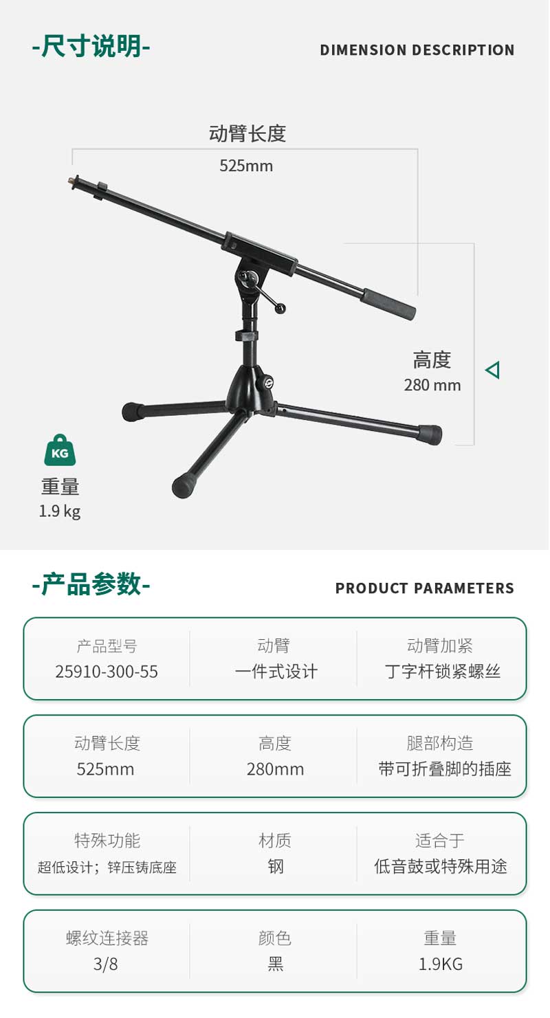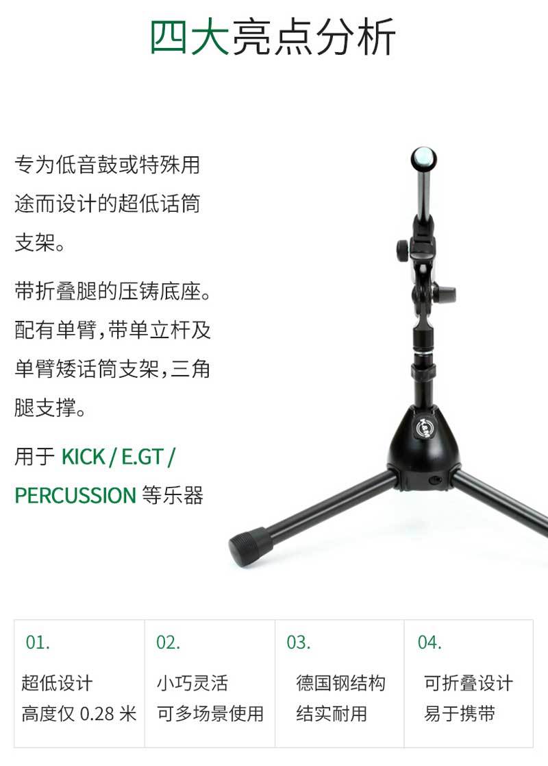 超低设计仅0.28米,特别适用于低鼓和其他特殊用途。压铸底座带折叠腿。配有伸缩杆,收纳、携带非常方便!
