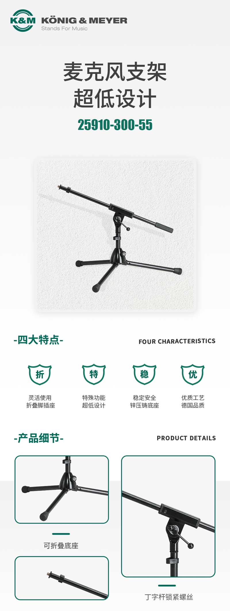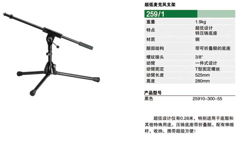 K&M 25910-300-55 超低麦克风支架 底鼓支架 矮的话筒支架 259/1 德国KM支架 底鼓话筒支架 落地式话筒支架 舞台话筒支架 高端话筒支架杆 高端麦克风支架 高端话筒支架