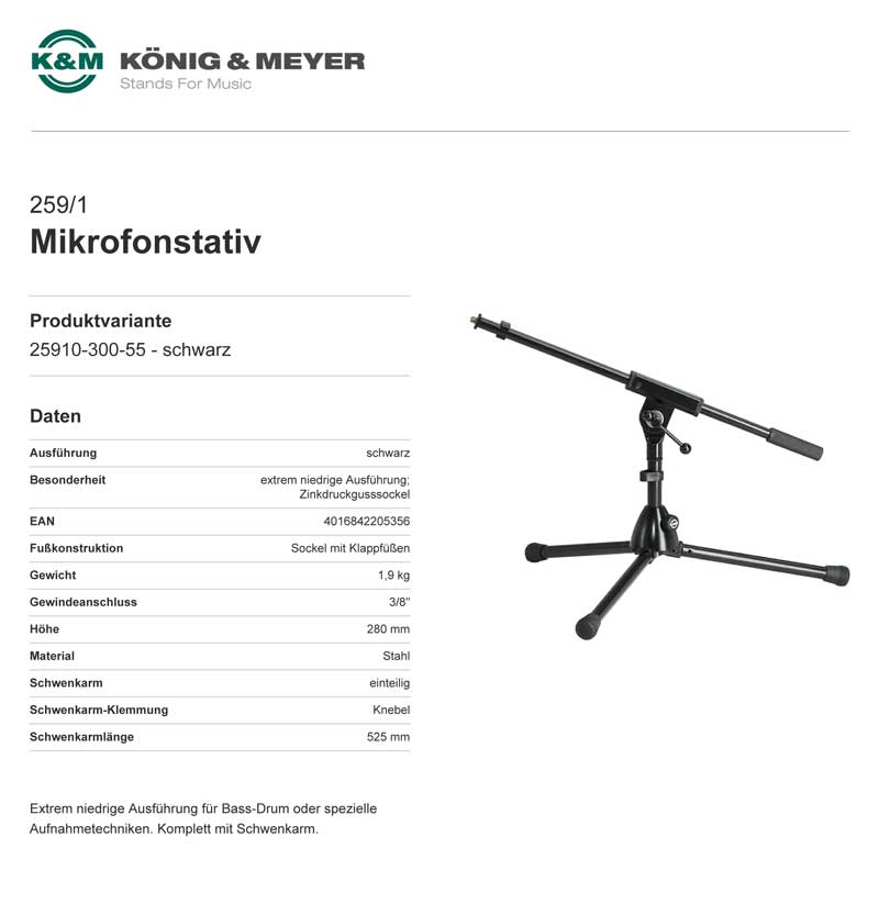 Extrem niedrige Ausführung für Bass-Drum oder spezielle Aufnahmetechniken. Komplett mit Schwenkarm.
