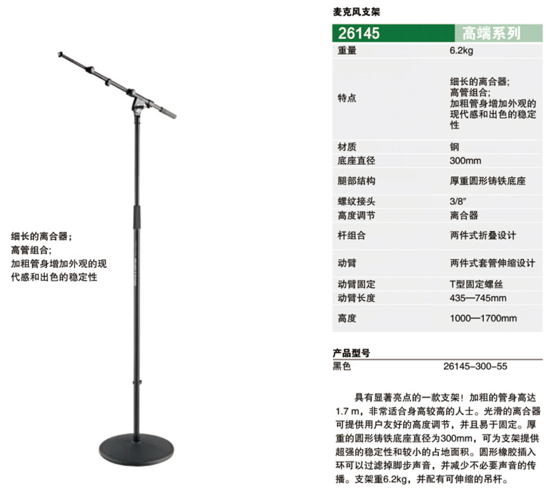 K&M 26145-300-55 麦克风支架 1.7米可调话筒支架 德国KM支架 话筒麦克风落地架麦克风支架 落地式话筒支架 舞台话筒支架 高档话筒支架杆 高档麦克风支架 高档话筒支架