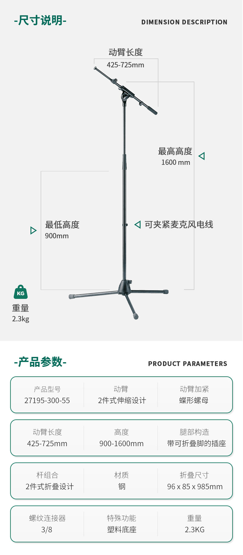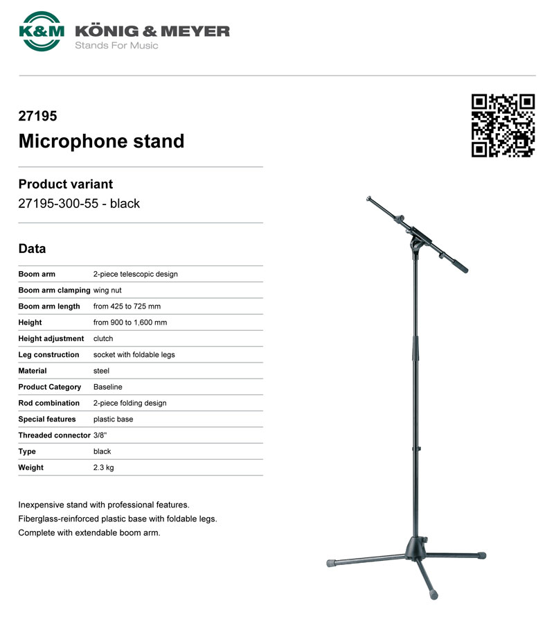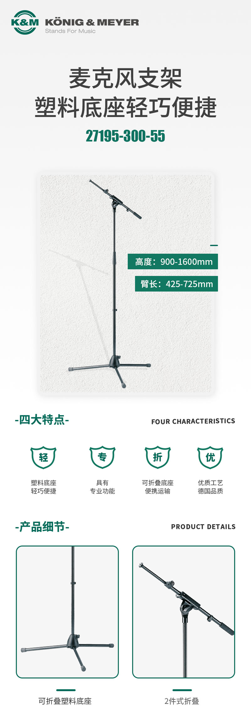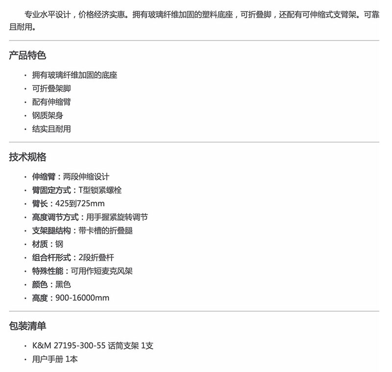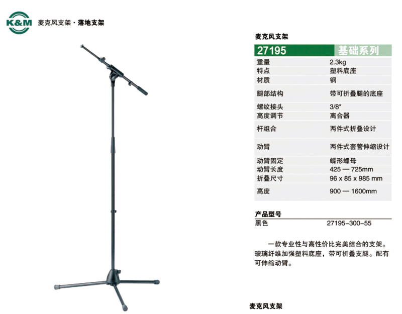 K&M 27195-300-55 麦克风支架 话筒架子 德国KM支架 伸缩可折叠1.6米高低可调KM短臂麦克风支架