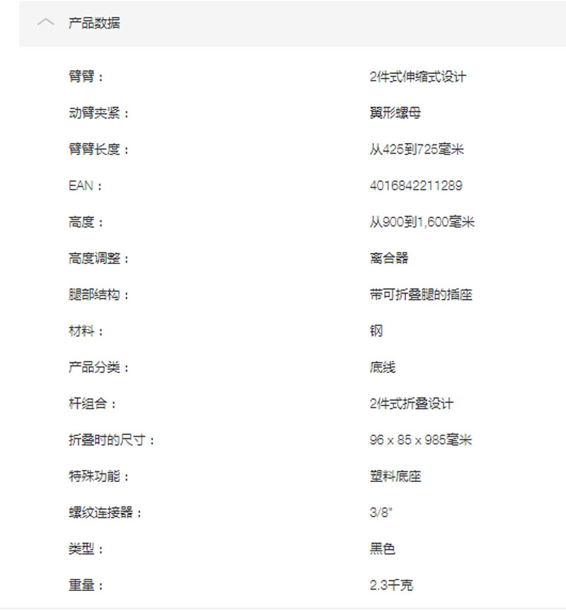 动臂长度:425至725mm毫米