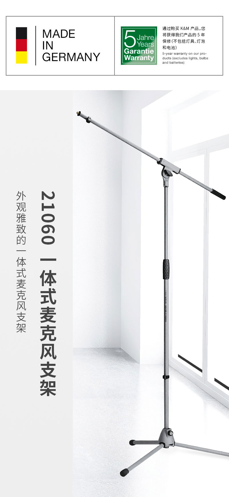 K&M 21060-300-87 灰色落地话筒支架 便携式话筒支架 德国K&M支架 1.6米麦克风话筒杆 KM话筒支架 K&M话筒架子单臂一体式可调话筒支架
