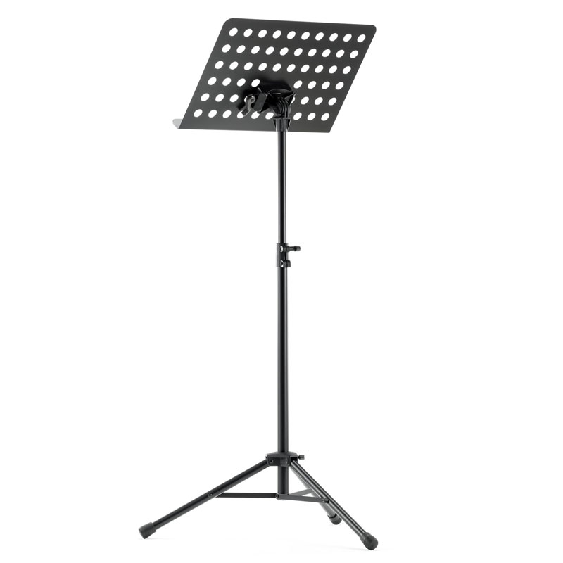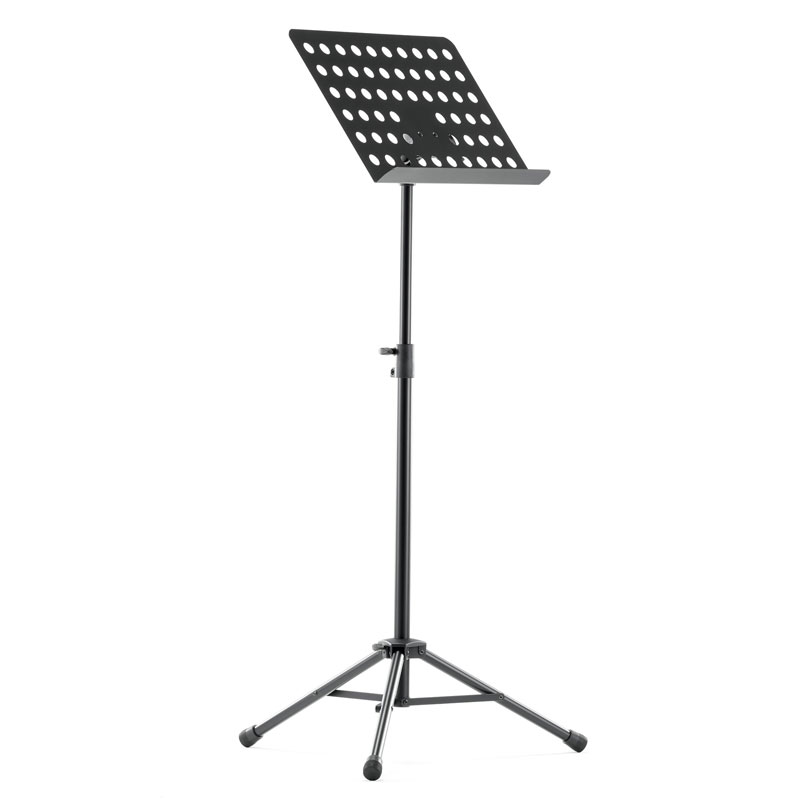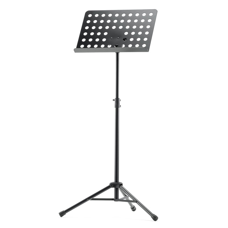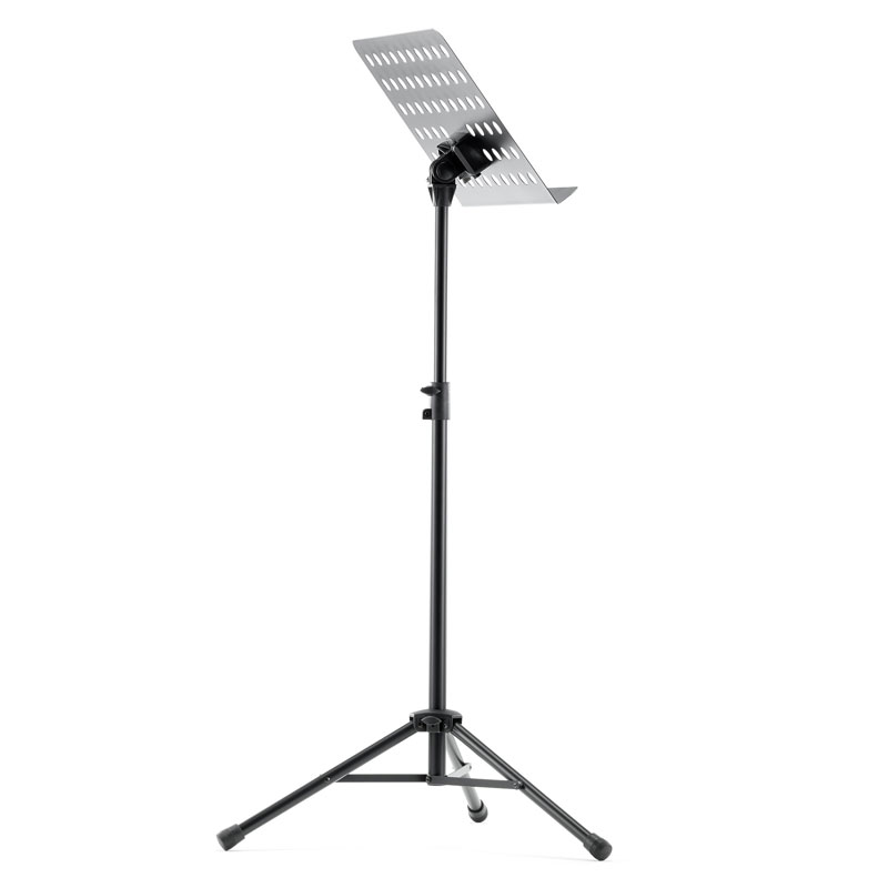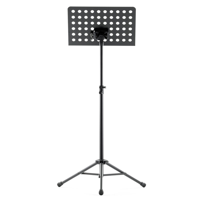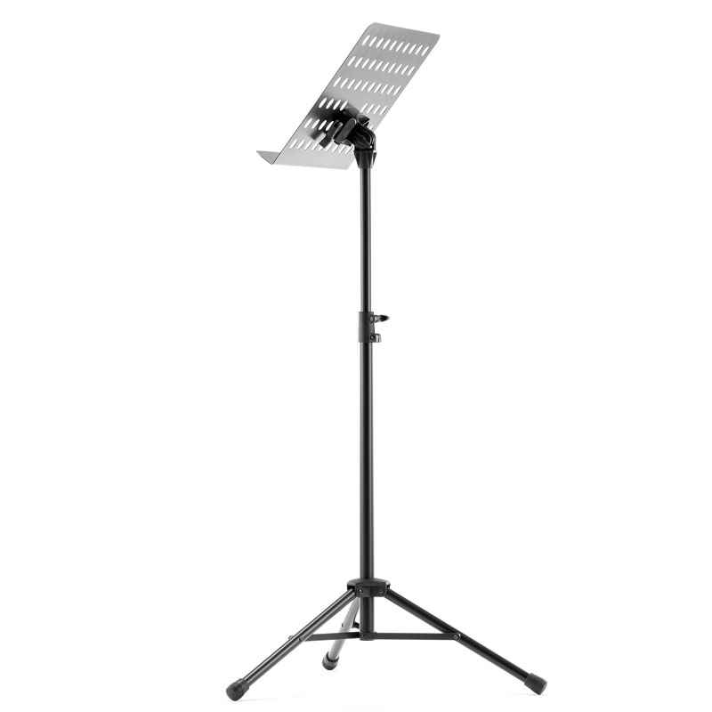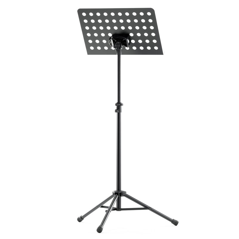Powder-coated, perforated steel music stand with plastic connecting elements. The music stand rest can be attached and removed using the plastic, user-friendly, quick-release lock. There is a large, easy-to-use wing nut making adjustment of the tilt easy. The stand can be freely adjusted to any height using the non-scratch tension sleeve.