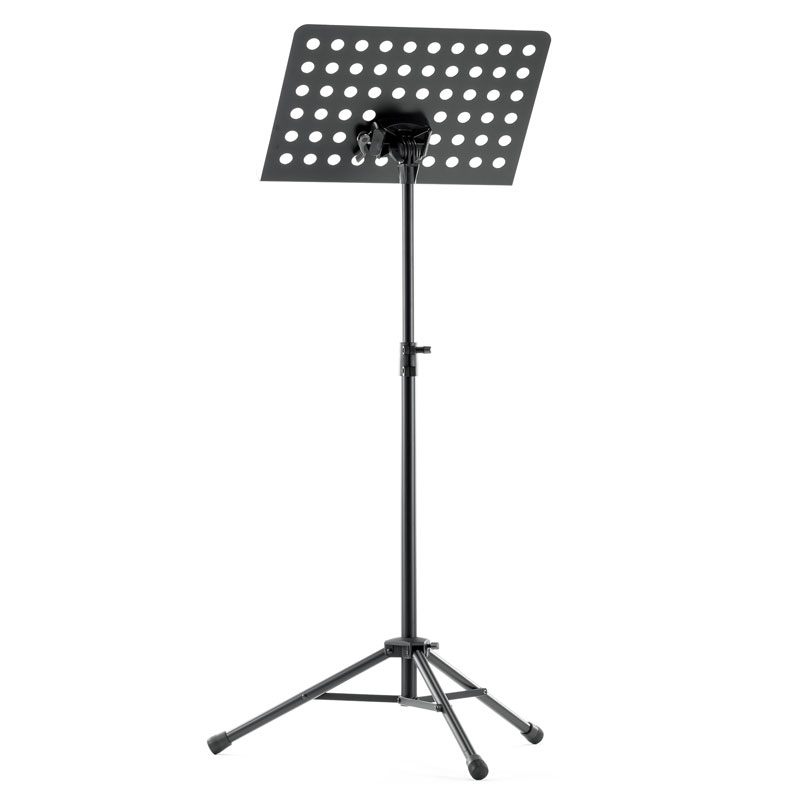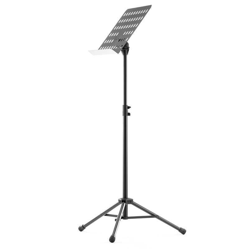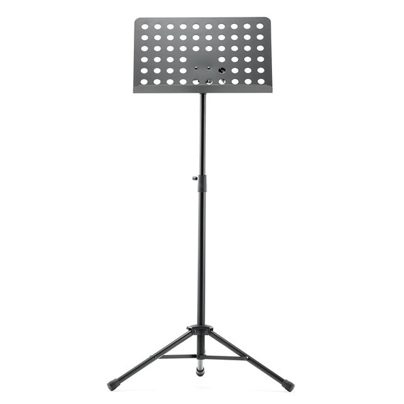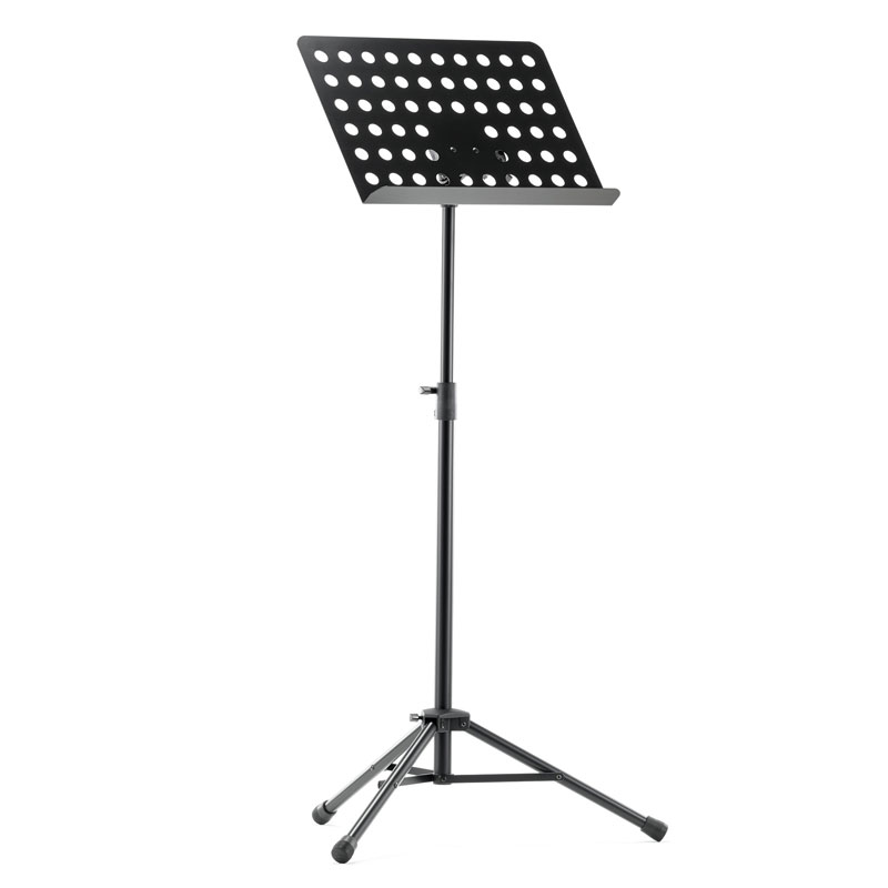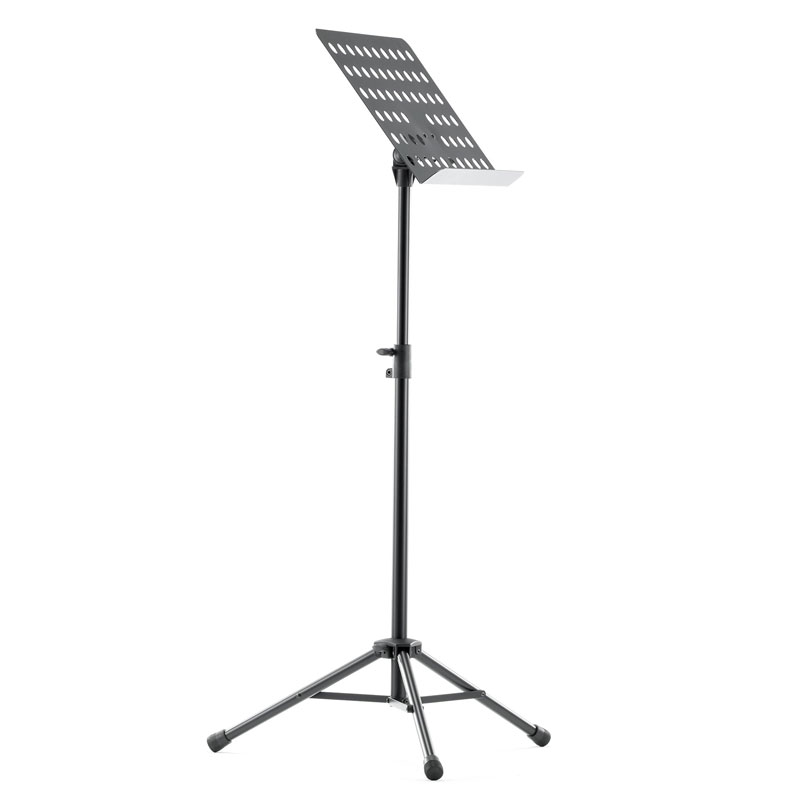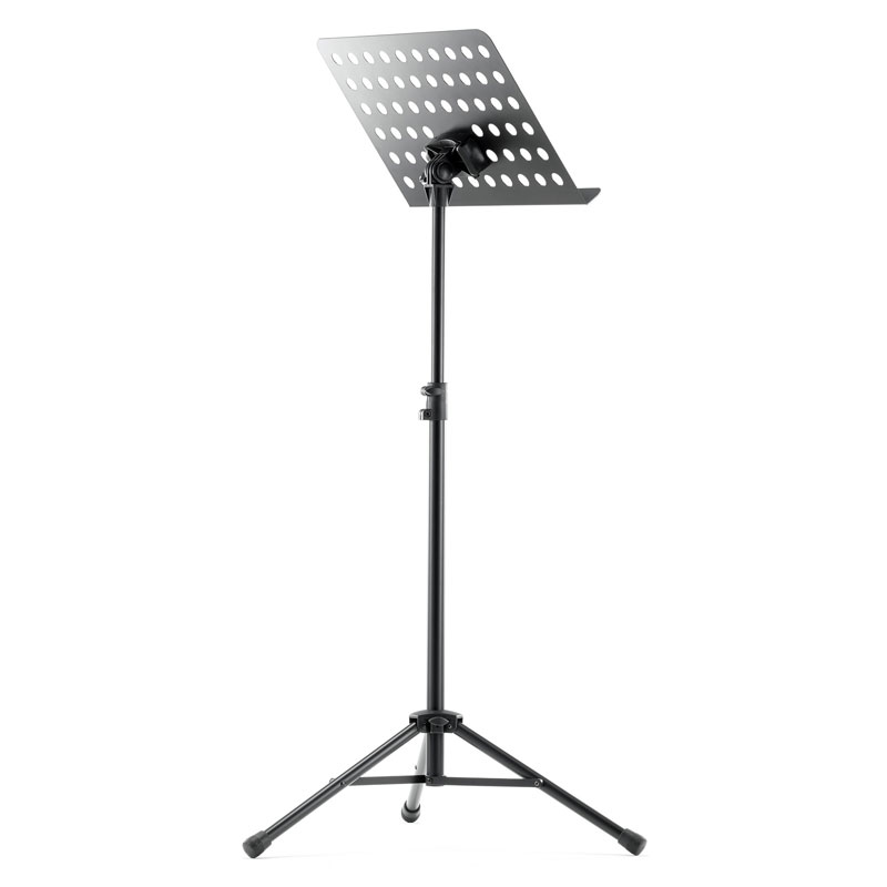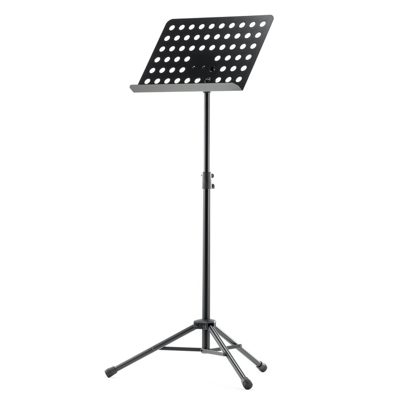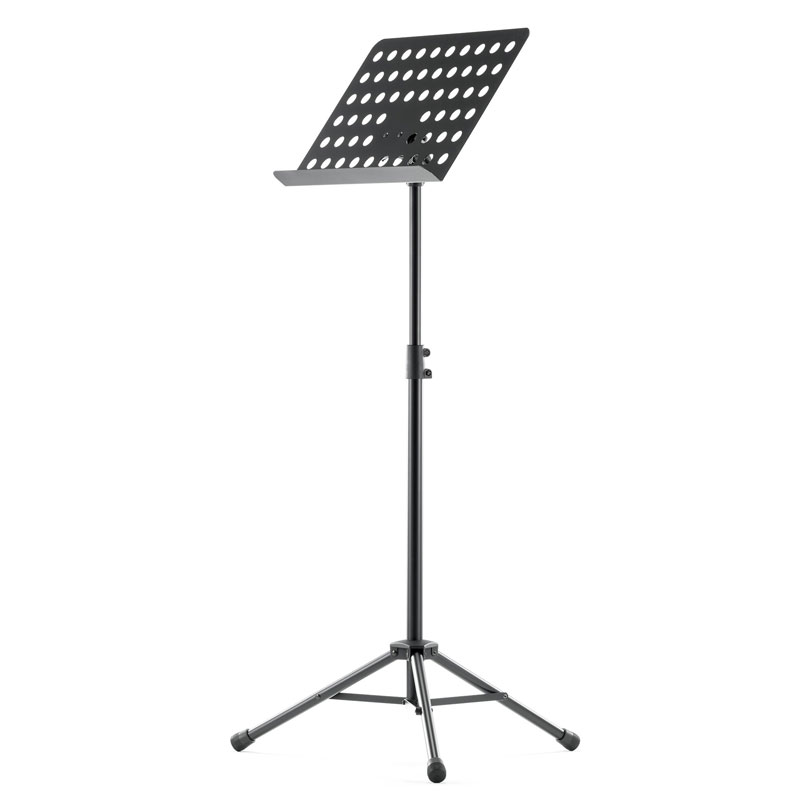 Powder-coated, perforated steel music stand with plastic connecting elements. The music stand rest can be attached and removed using the plastic, user-friendly, quick-release lock. There is a large, easy-to-use wing nut making adjustment of the tilt easy. The stand can be freely adjusted to any height using the non-scratch tension sleeve.