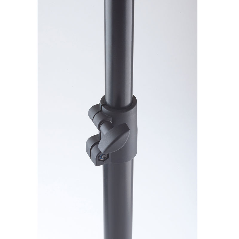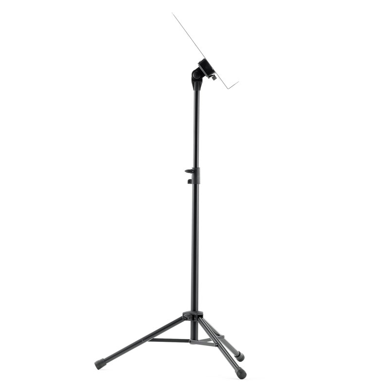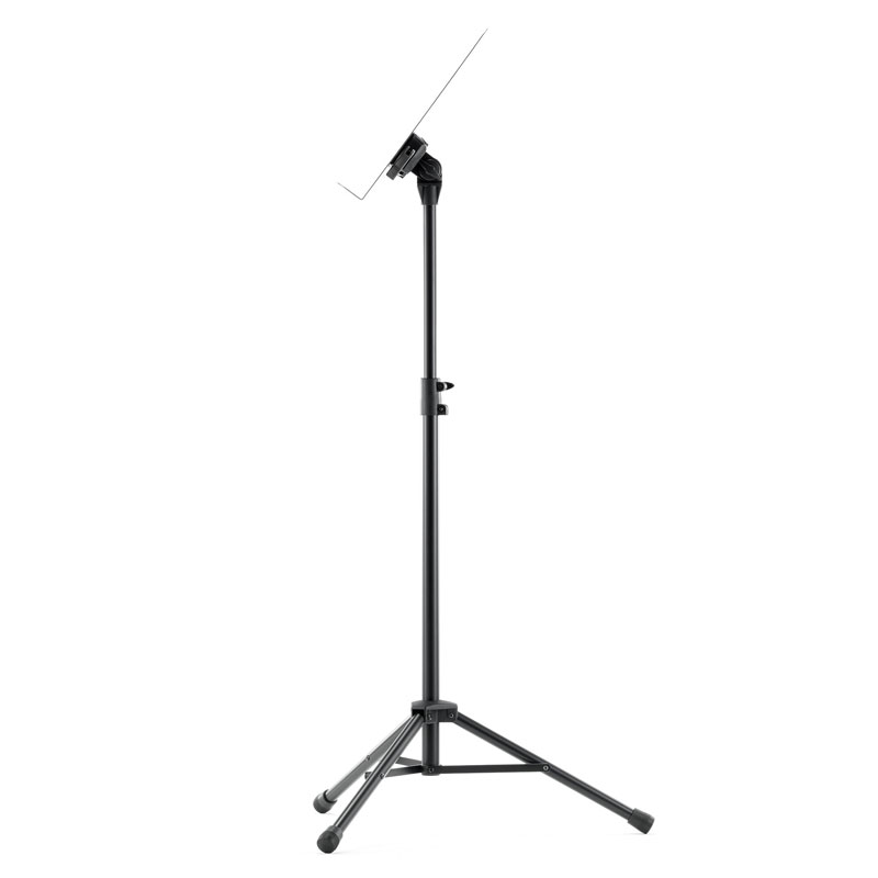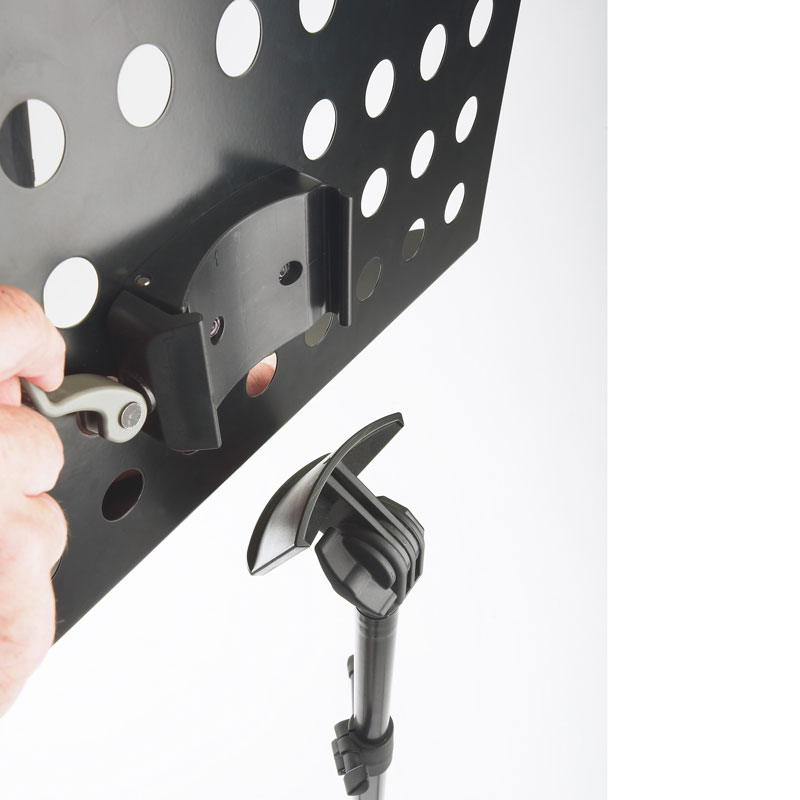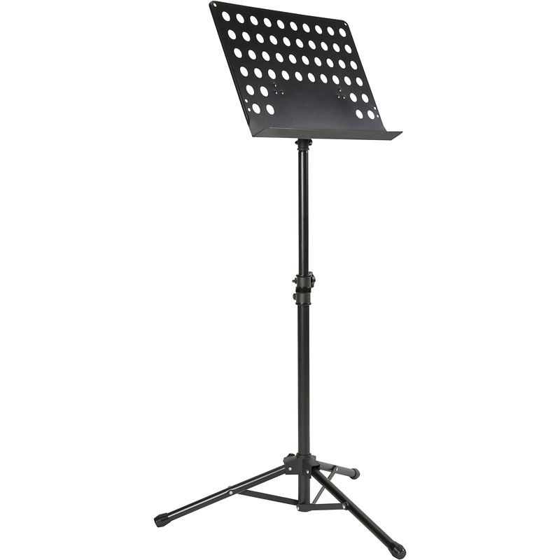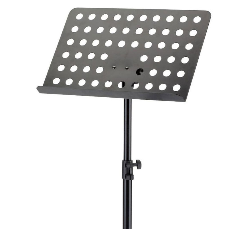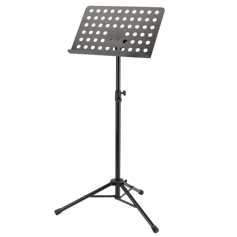 Powder-coated, perforated steel music stand with plastic connecting elements. The music stand rest can be attached and removed using the plastic, user-friendly, quick-release lock. There is a large, easy-to-use wing nut making adjustment of the tilt easy. The stand can be freely adjusted to any height using the non-scratch tension sleeve.