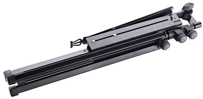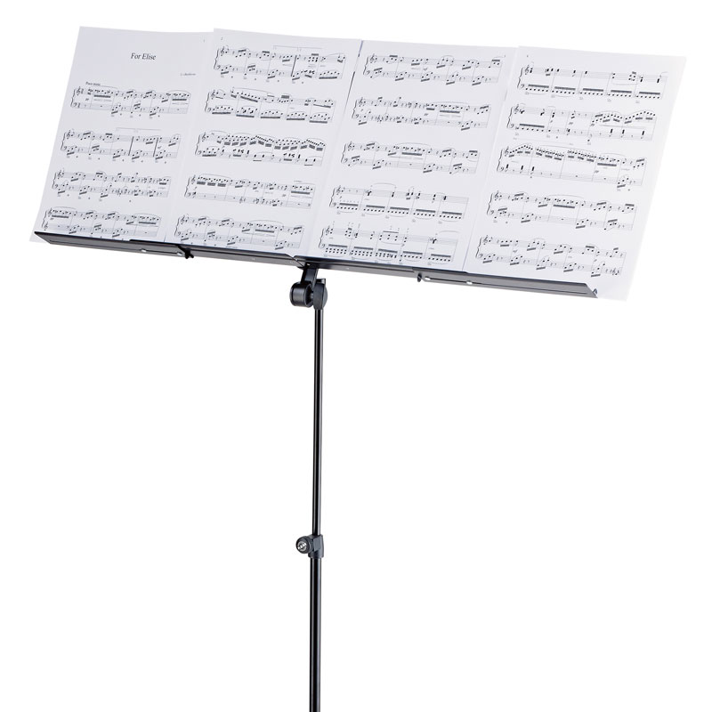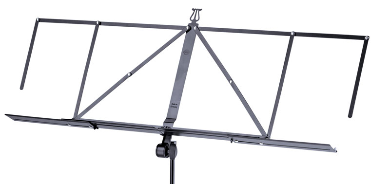 This music stand is equipped with an expandable music desk. Both music rests can be expanded to the right and the left and together with the additional sheet music holder provide for the viewing of 4 DIN A4 sheets of music next to each other. The comfortable angle is facilitated through very fine zinc-die-cast teeth. The expandable music desk collapses to a small and easy to transport size.