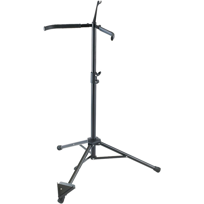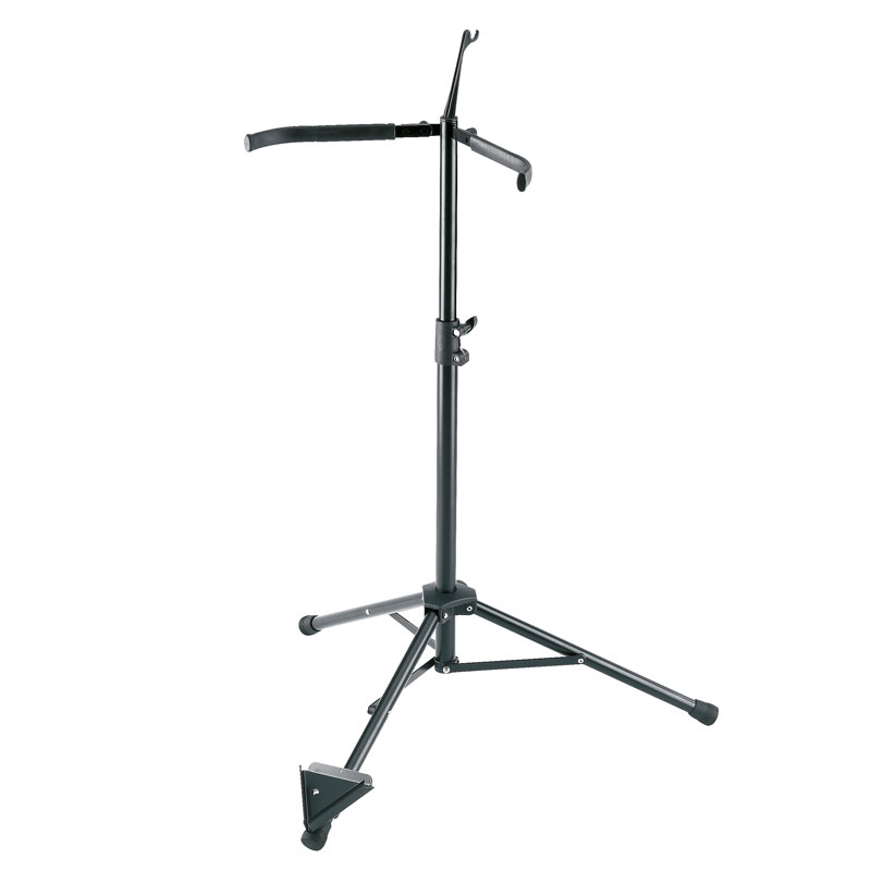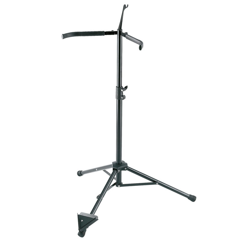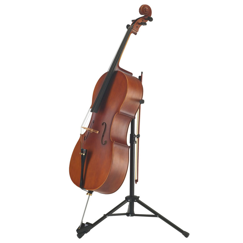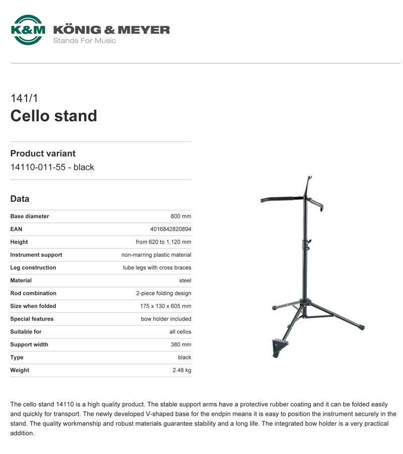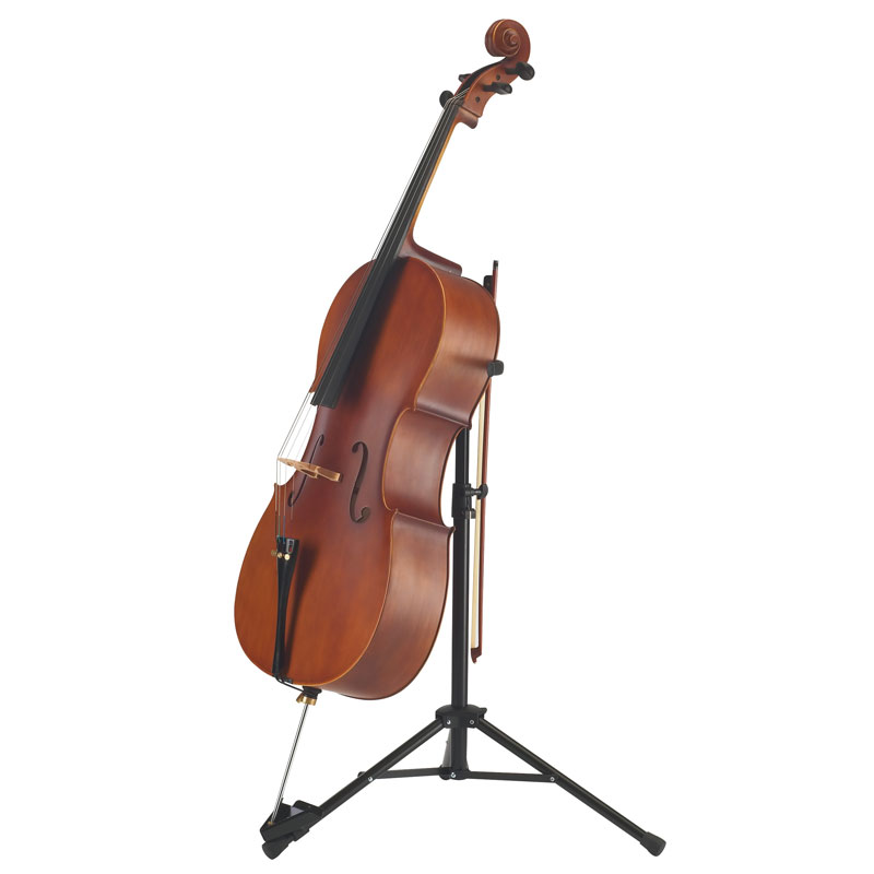 The cello stand 14110 is a high quality product. The stable support arms have a protective rubber coating and it can be folded easily and quickly for transport. The newly developed V-shaped base for the endpin means it is easy to position the instrument securely in the stand. The quality workmanship and robust materials guarantee stability and a long life. The integrated bow holder is a very practical addition.