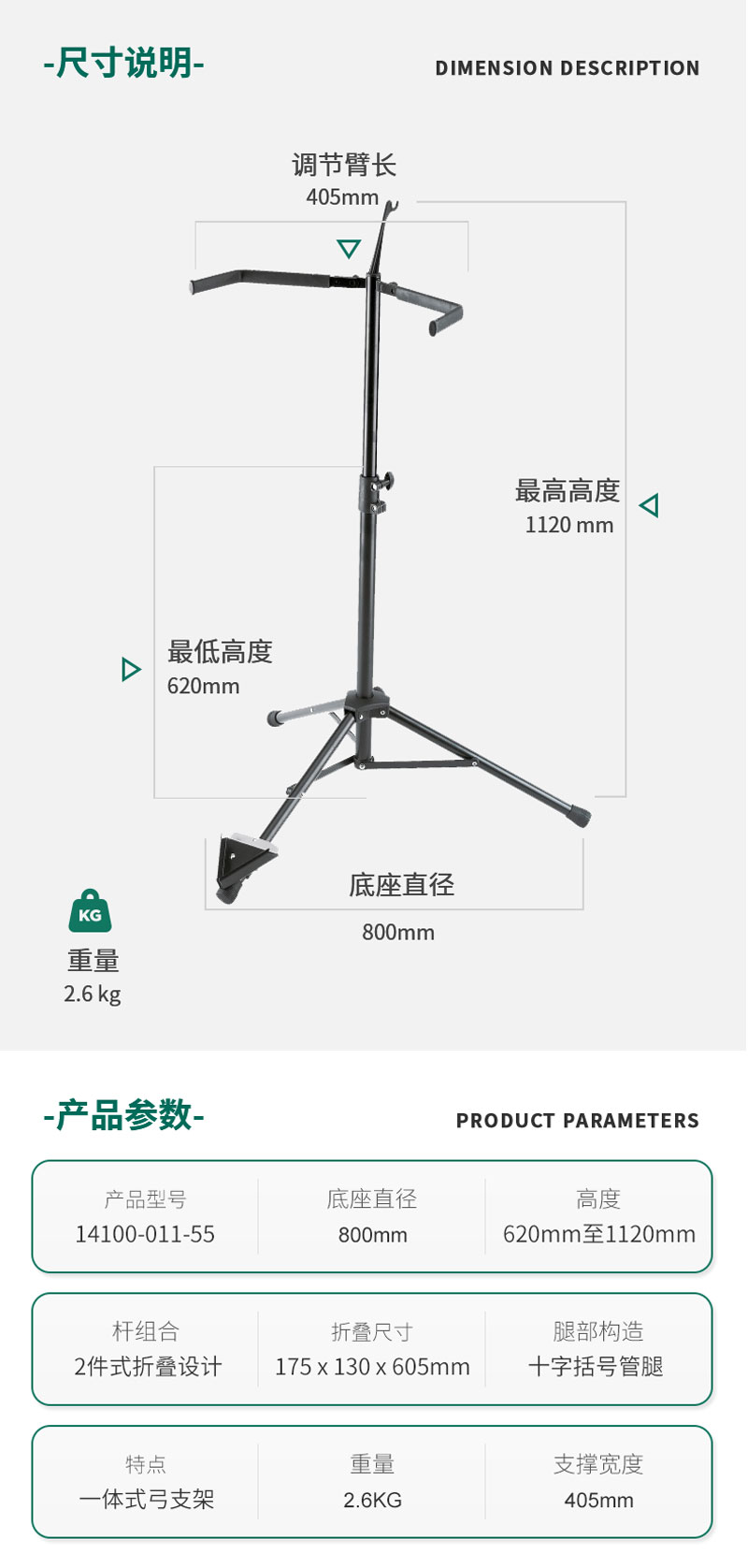 14100低音提琴支架是高品质的产品。其稳定的支撑臂具有保护性的橡胶涂层,支架易于折叠以便运输。新开发的用于端销的V形基座意味着可以轻松地将仪器牢固地放置在支架上。优质的工艺和坚固的材料可确保稳定性和长寿命。集成的弓架是非常实用的。