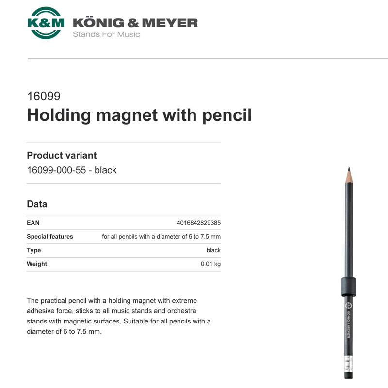 The practical pencil with a holding magnet with extreme adhesive force, sticks to all music stands and orchestra stands with magnetic surfaces. Suitable for all pencils with a diameter of 6 to 7.5 mm.