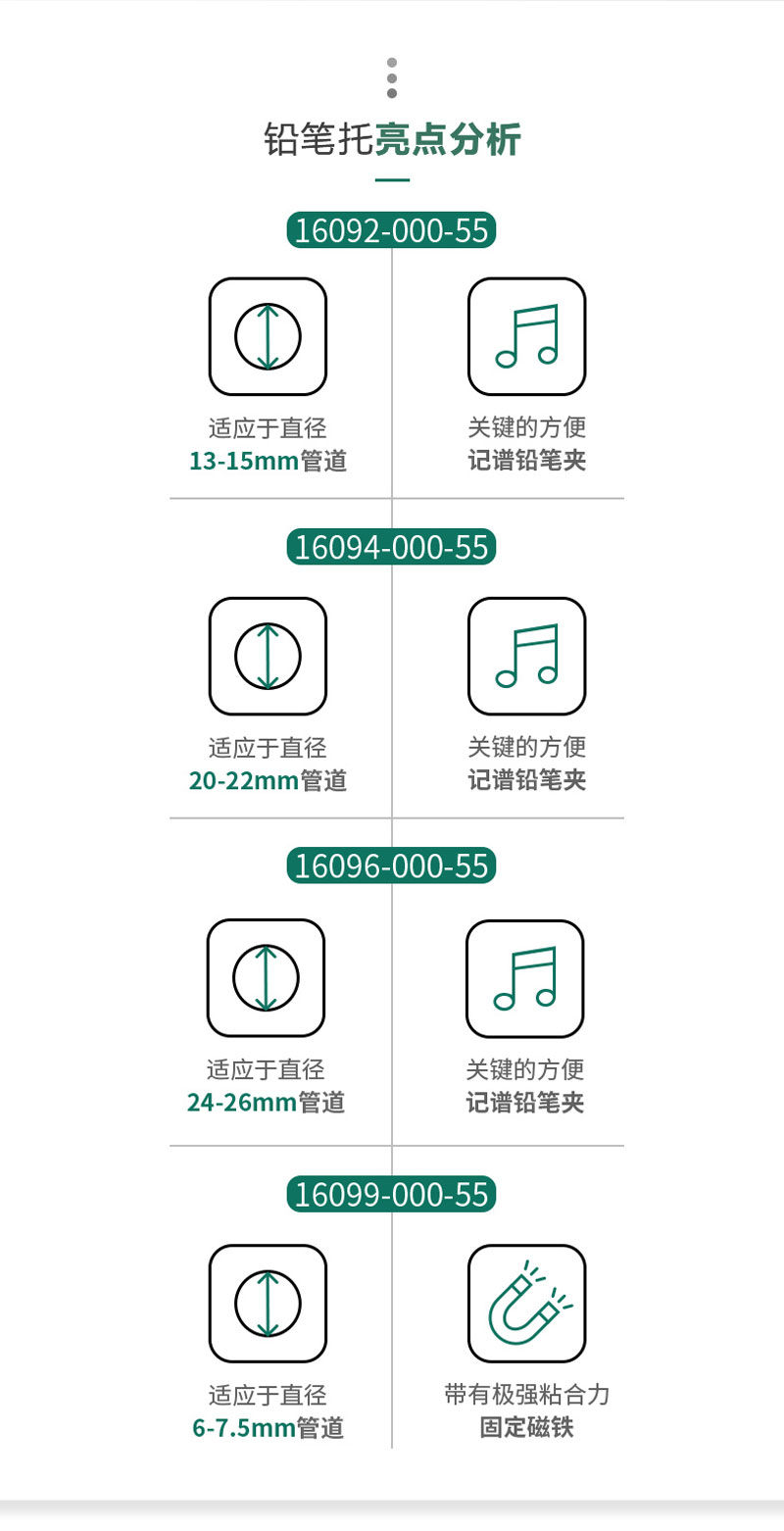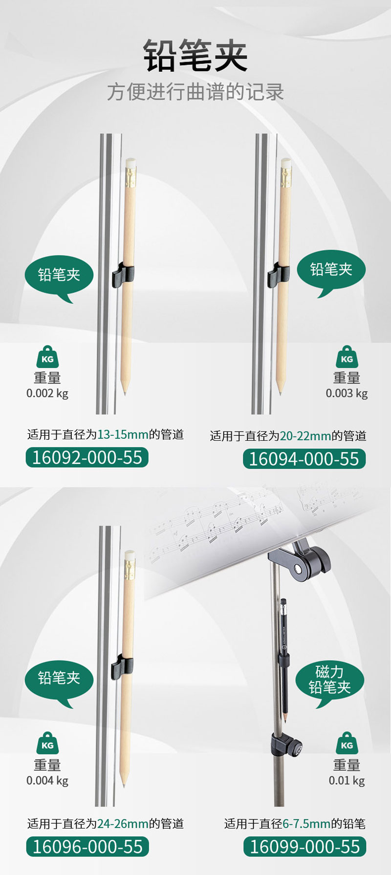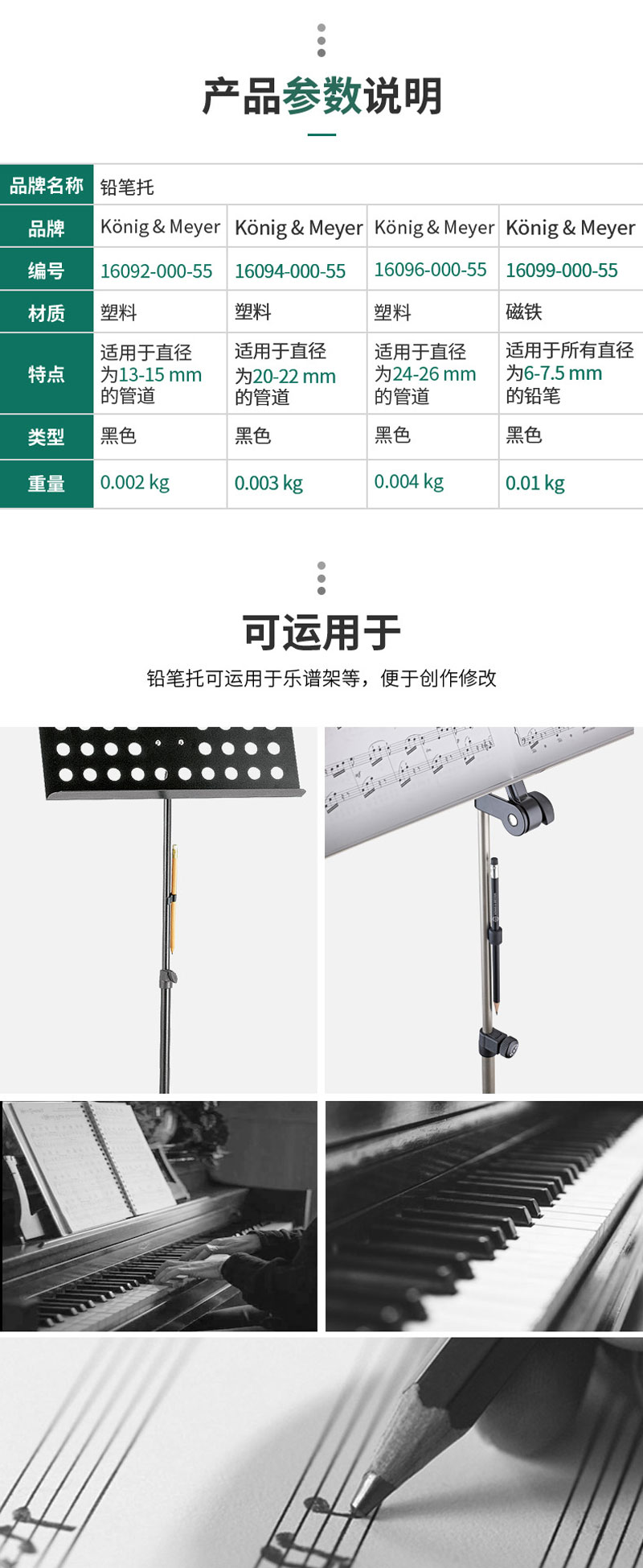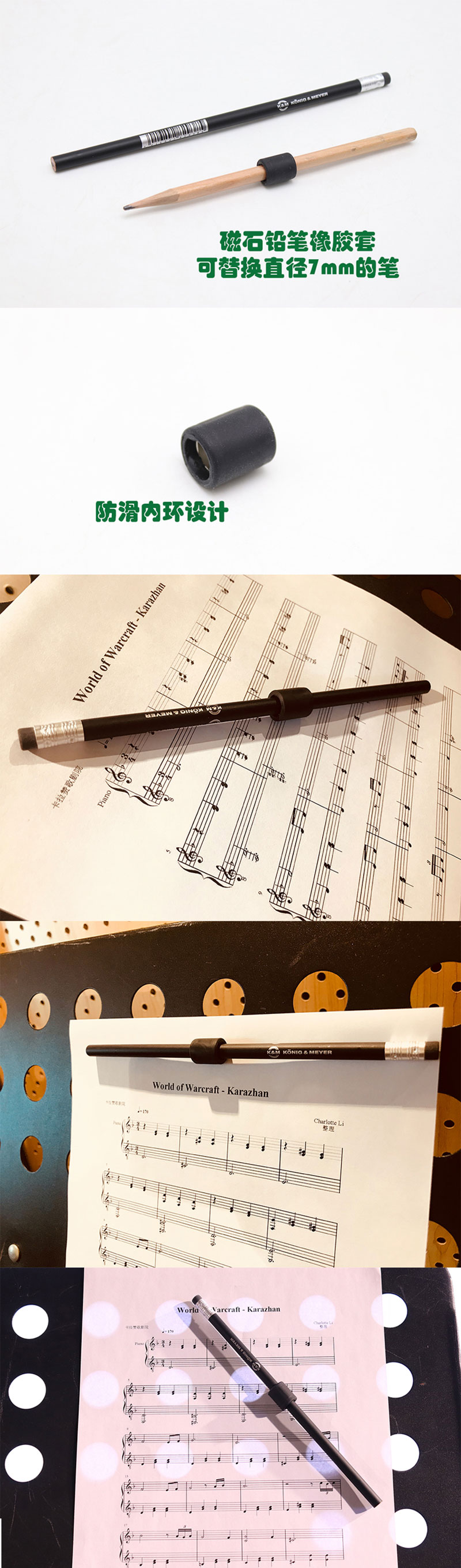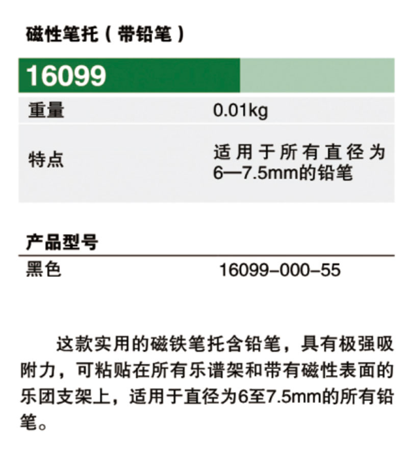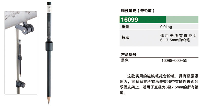 ①这款实用的铅笔具有极强粘着力的固定磁铁,可粘贴在所有乐谱架和带有磁性表面的乐团支架上;