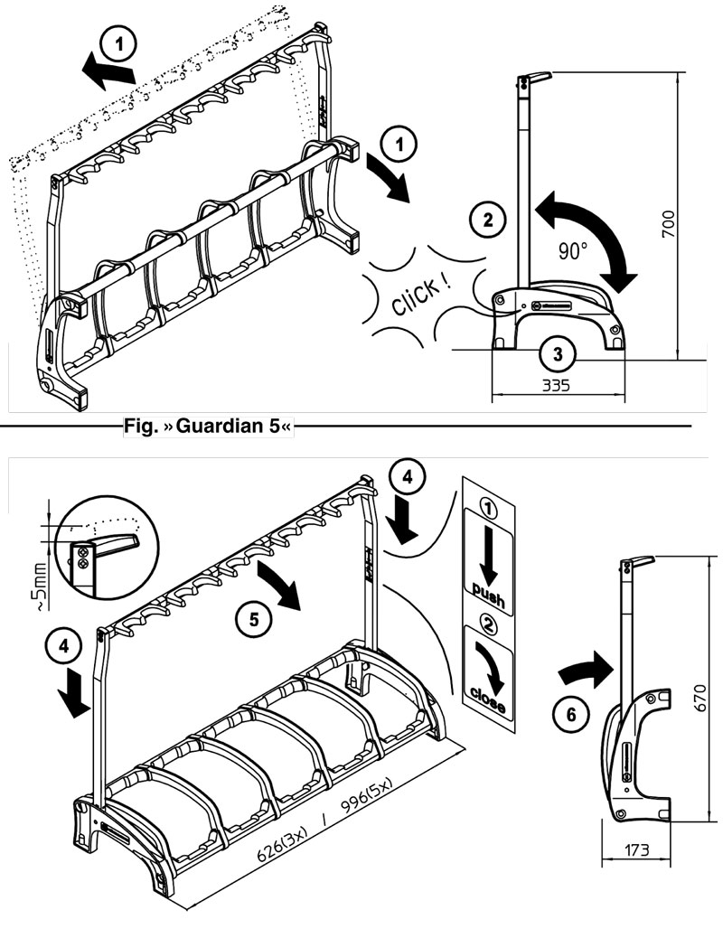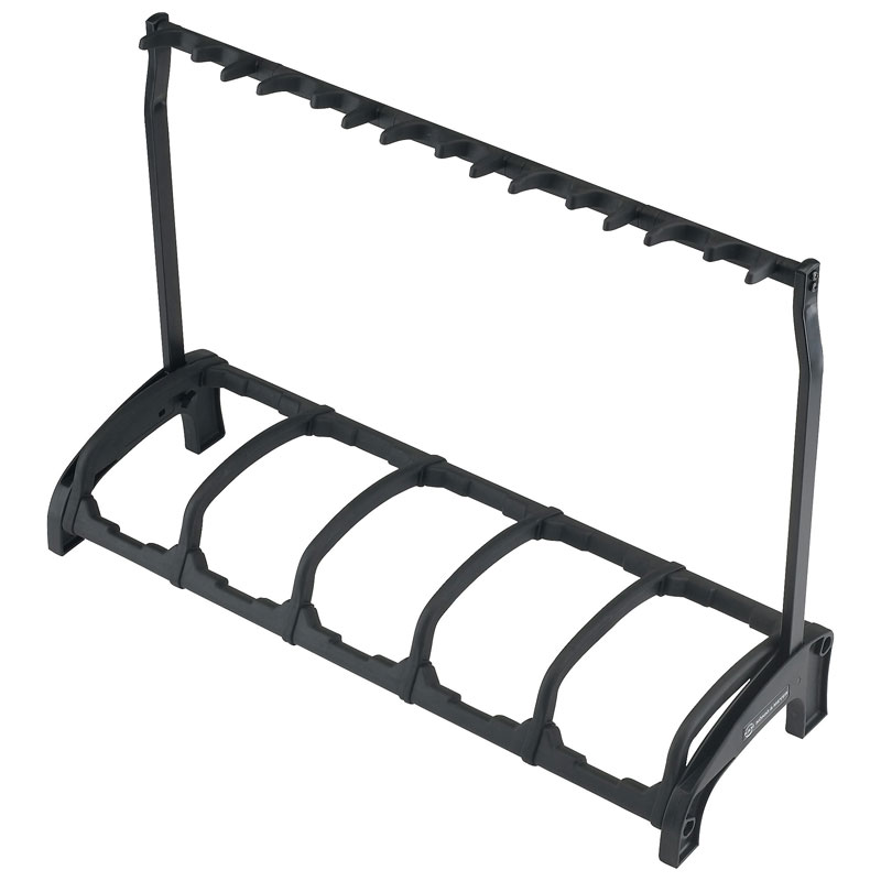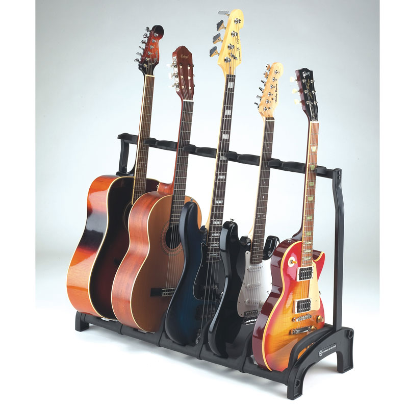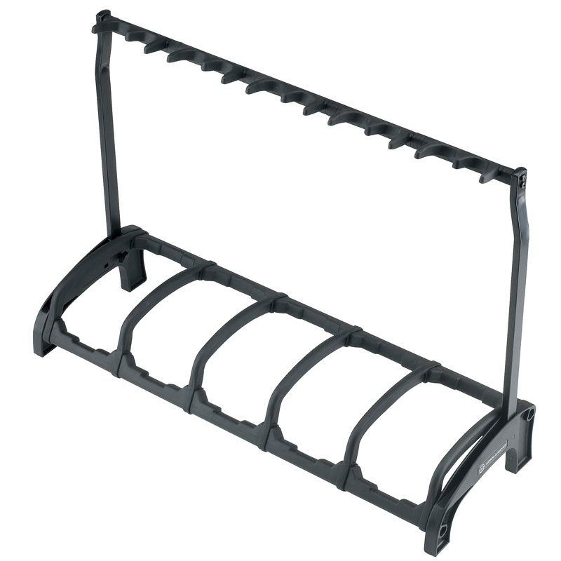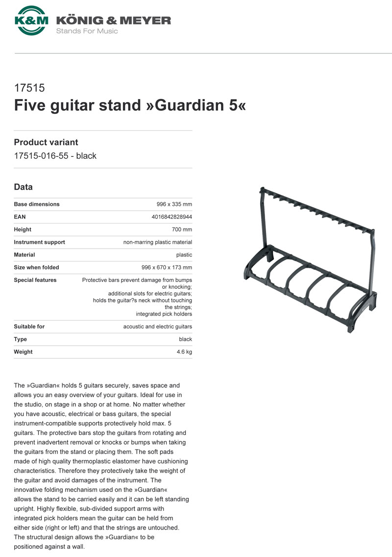 The ?Guardian? holds 5 guitars securely, saves space and allows you an easy overview of your guitars. Ideal for use in the studio, on stage in a shop or at home. No matter whether you have acoustic, electrical or bass guitars, the special instrument-compatible supports protectively hold max. 5 guitars. The protective bars stop the guitars from rotating and prevent inadvertent removal or knocks or bumps when taking the guitars from the stand or placing them. The soft pads made of high quality thermoplastic elastomer have cushioning characteristics. Therefore they protectively take the weight of the guitar and avoid damages of the instrument. The innovative folding mechanism used on the ?Guardian? allows the stand to be carried easily and it can be left standing upright. Highly flexible, sub-divided support arms with integrated pick holders mean the guitar can be held from either side (right or left) and that the strings are untouched. The structural design allows the ?Guardian? to be positioned against a wall.