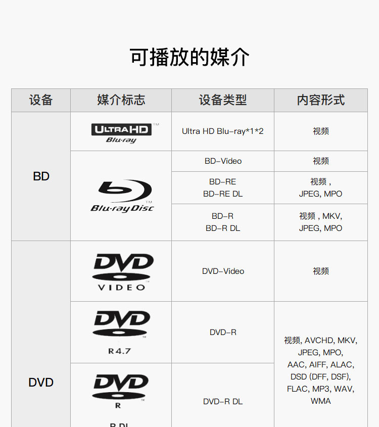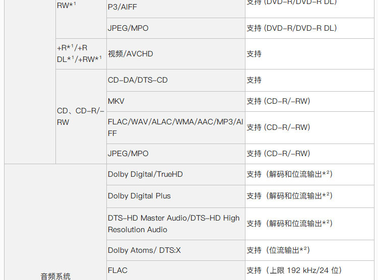 BD-R(版本 1.3)/BD-R DL(版本 2) BDAV/AVCHD/AVCHD 3D/MKV/JPEG/MPO 支持