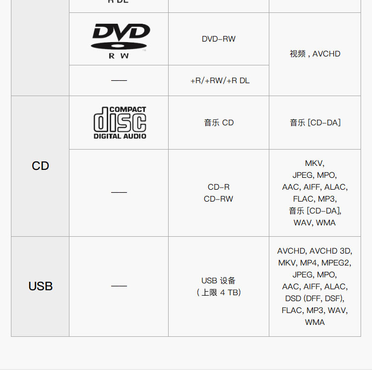 FLAC/WAV/ALAC/DSD/WMA/AAC/MP3/AIFF 支持 (DVD-R/DVD-R DL)