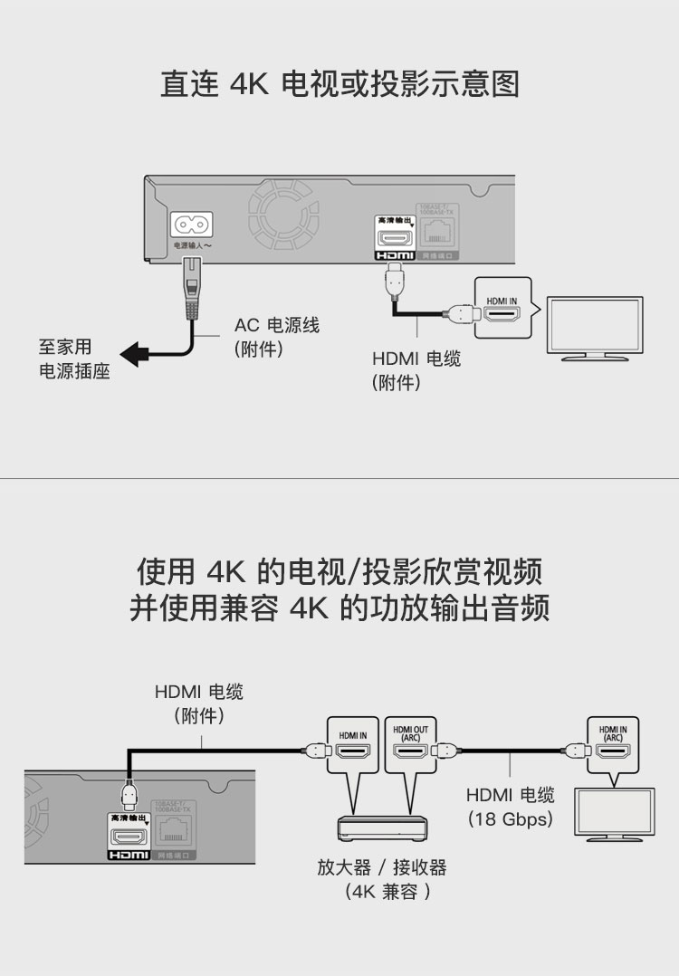 温馨提示:此款蓝光DVD只有一个HDMI输出,如果您功放带HDMI输入和输出的可以用,如果不带的话音频从电视上输出接功放或者音响。