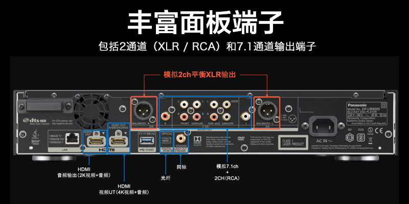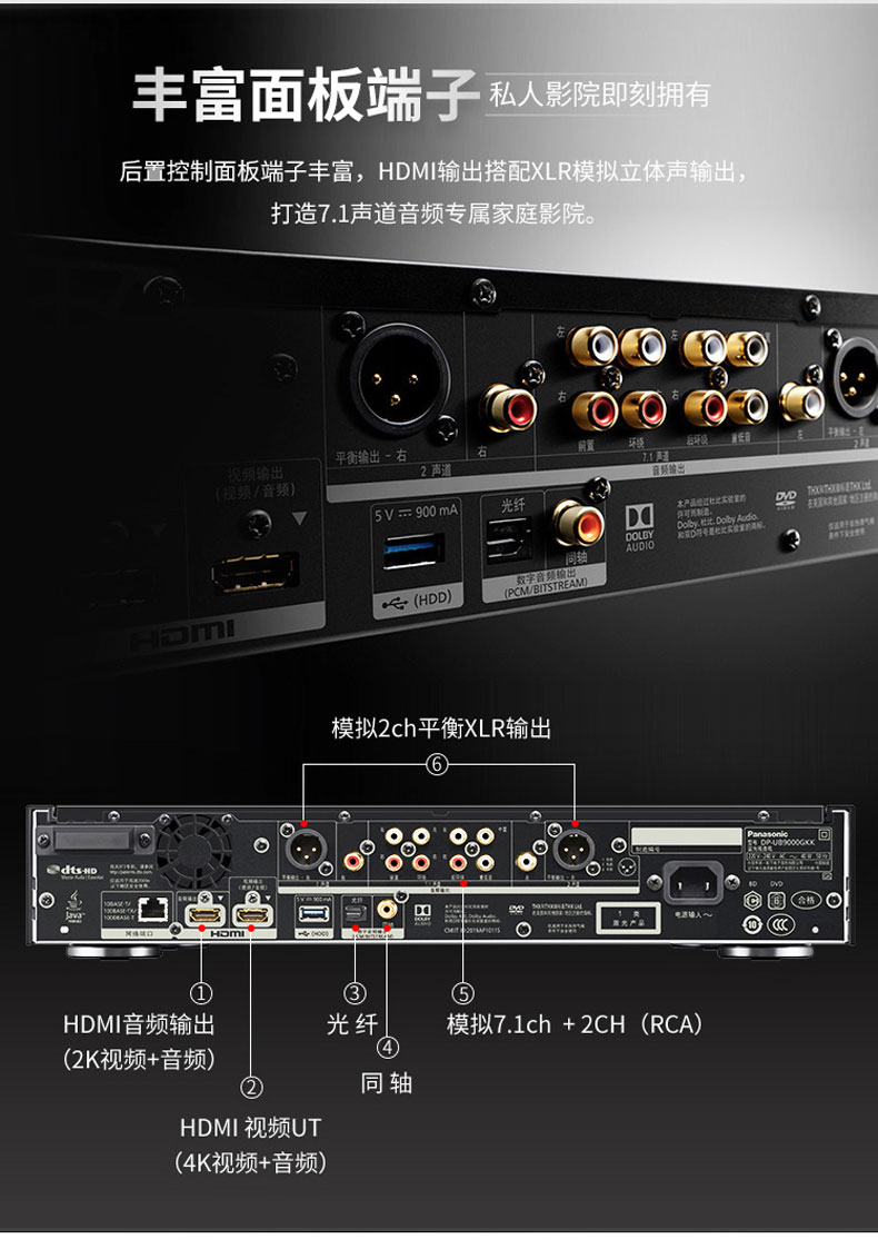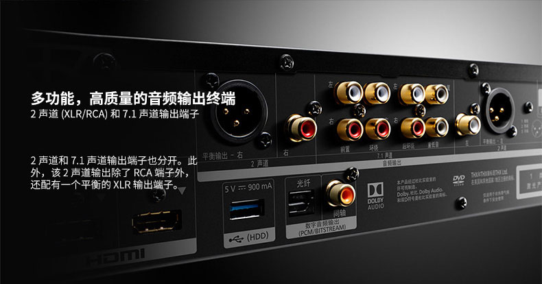 HDMI输出搭配XLR模拟立体声输出,打造专属家庭影院