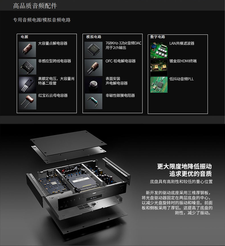 前面板和侧面板采用厚铝板设计 有效减少光盘旋转、蓝光机运行中的震动和噪音