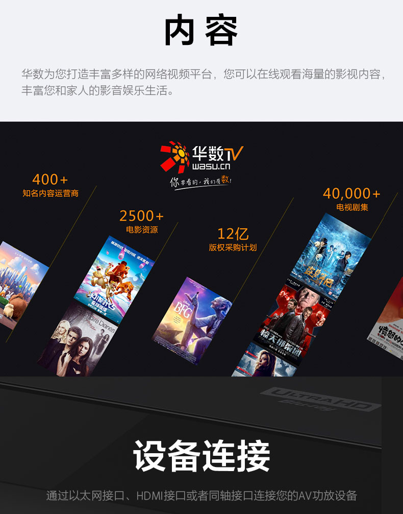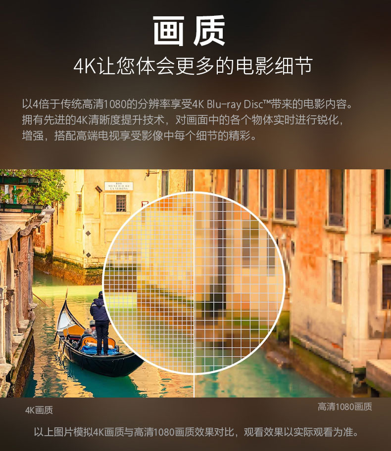画 质4K让您体会更多的电影细节以4倍于传统高清1080的分辨率享受4K Blu-ray Disc?带来的电影内容。拥有先进的4K清晰度提升技术,对画