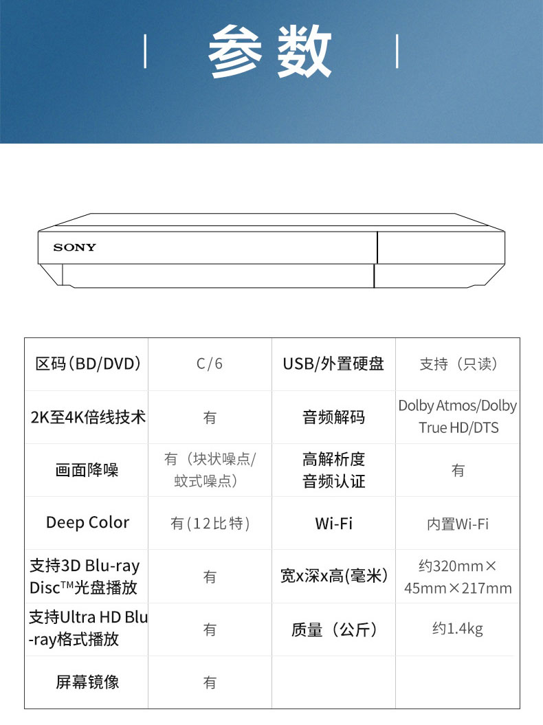 支持 Ultra HD Blu-ray ?/ 2K至4K倍线技术 / 数字降噪 / 杜比视界 / HDR 至 SDR 转换 / 高解析度音频 / 网络视频 / 内置Wi-fi / USB媒体播放