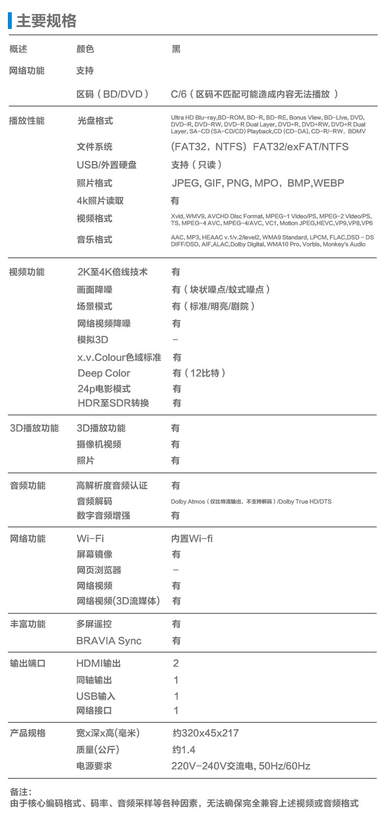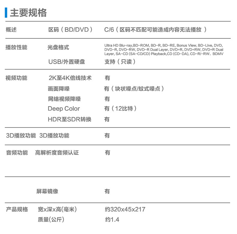 区码(BD/DVD) C/6(区码不匹配可能造成内容无法播放 )