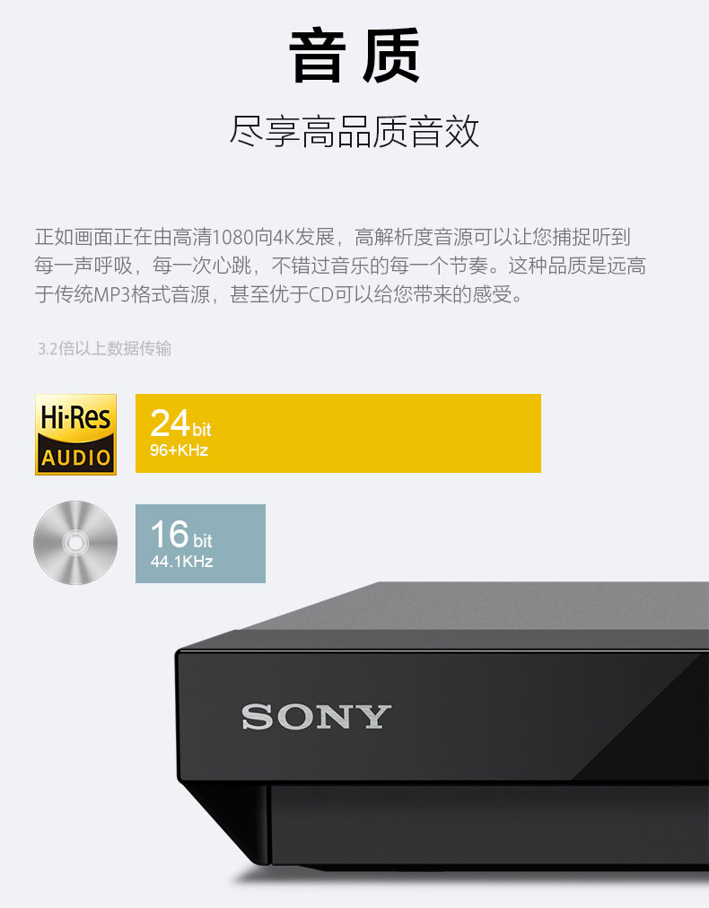 正如画面正在由高清1080向4K发展,高解析度音源可以让您捕捉听到每一声呼吸,每一次心跳,不错过音乐的每一个节奏。这种品质是远高于传统MP3格式音源,甚至优于CD可以给您带来的感受。