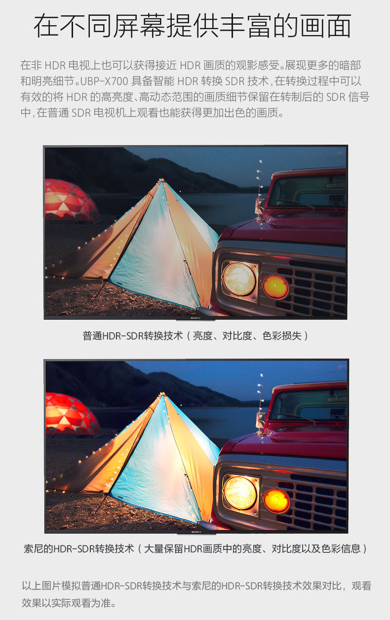 在不同屏幕提供丰富的画面在非HDR电视上也可以获得接近HDR画质的观影感受。展现更多的暗部和明亮细节。UBP-X700具备智能