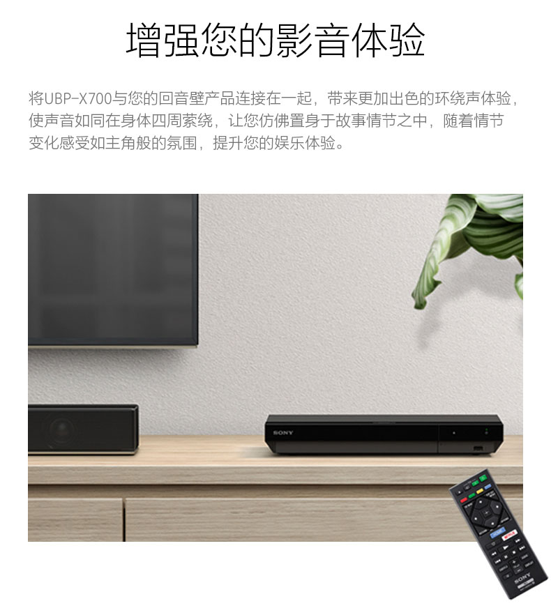 将UBP-X700与您的回音壁产品连接在一起,带来更加出色的环绕声体验,使声音如同在身体四周萦绕,让您仿佛置身于故事情节之中,随着情节变化感受如主角般的氛围,提升您的娱乐体验。