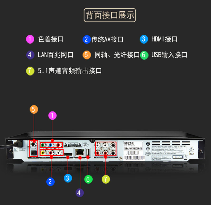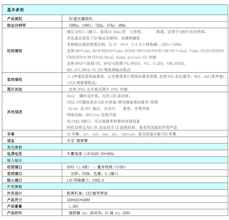 其它功能 MT8560SBAG芯片,智能互联网影视平台,自主外观设计,金属范十足;HDMI1.4接口,1080P全高清输出,画质更完美细腻;精心打造的交互UI;3D格式全兼容,智能高清内容平台,网络影视在线看,极佳用户体验;超强本地播放,纠错能力强劲、0障碍播放;DLNA多屏互动、资源无线共享;BD-Live蓝光播放机的多源互动,丰富接口、连接多种家居视听设备