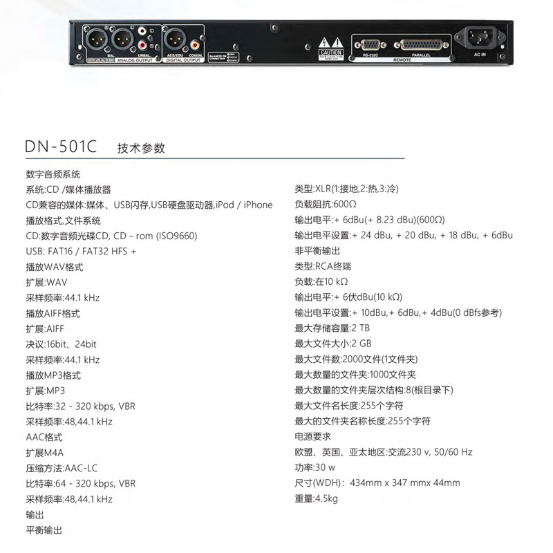 DN-501C,一个广播级CD/USB/媒体播放器,500系列最新升级产品,定位天龙专业A/V产品专业安装领域。1U机架更便携地安装,用最低廉的价格满足专业客户需求。高亮度OLED显示器、插槽式CD驱动、USB端口媒体回放和多功能旋钮控制,让DN-501C满足广播、健身、舞蹈等多种应用场所。
