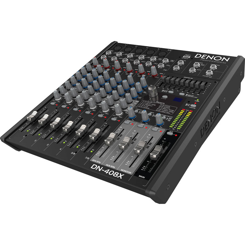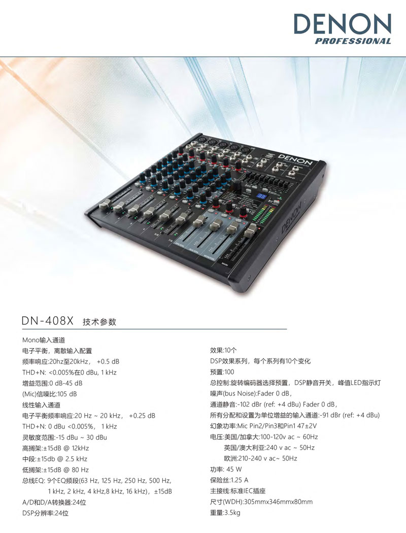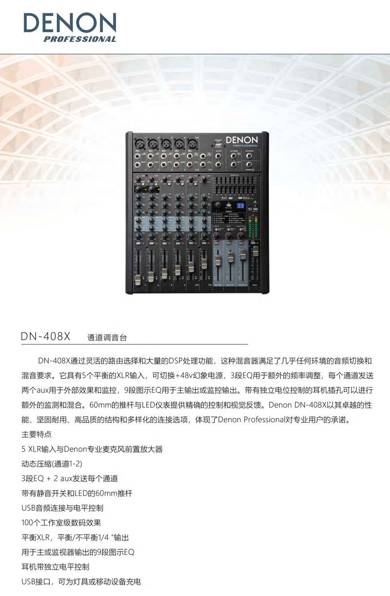 考虑到公众演讲、会议和表演艺术等场所使用需求,带8通道和2总线的紧凑型桌面混音器DN-408X为其了最大的性能。