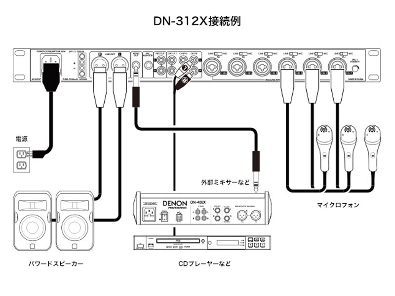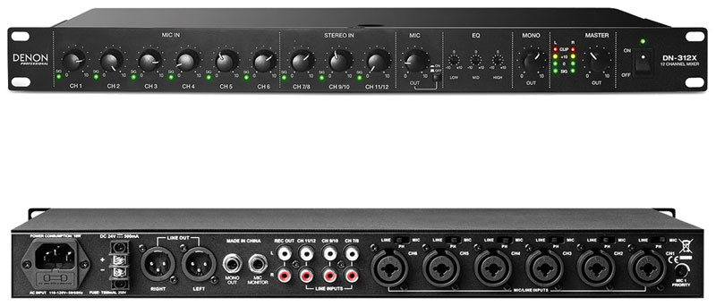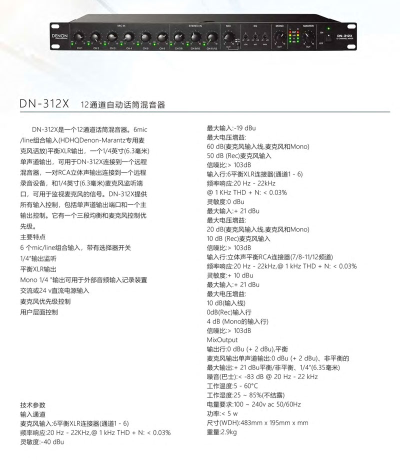 DN-312X是一个超薄的1U机架安装的12通道混频器,有6个MIC/LINE组合输入(HDHQ? Denon-Marantz专有麦克风话放)和6个额外的LINE输入。拥有一对平衡XLR输出,一个6.3mm单声道输出可以用来级联下一台DN-312X,一对RCA立体声输出连接到远程录音设备,以及6.3mm监听输出用于监视麦克风的信号。DN-312X除了为单通道输出和主输出提供电平控制外,还为所有输入通道提供单独的电平控制。它有一个三段均衡器和一路话筒优先级。