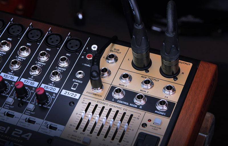 Model 24的Master部分设计用于在现场表演和跟踪过程中快速直观地使用。 适用于主混音的优质100mm推子,包括监听器和子混音以及静音和分配按钮。 正上方是板载数字效果处理器的控件,可让您将混响,延时,合唱,镶边效果等添加到一个或多个源和目的地。