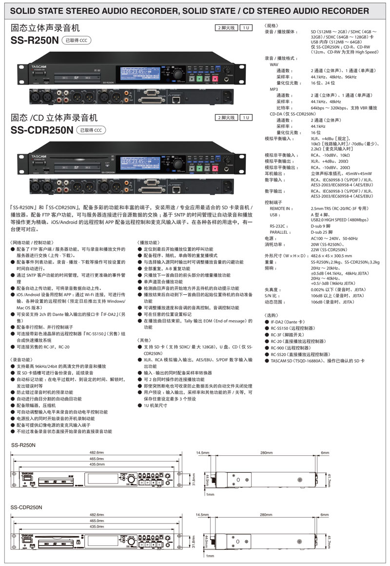 SS-R250N / SS-CDR250N是一个双声道录音机/播放器,适用于带各种远程控制选项的网络应用。