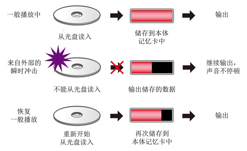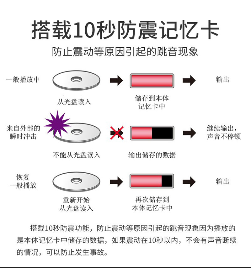 搭载10秒防震功能,防止震动等原因引起的跳音现象因为播放的是本体记忆卡中储存的数据,如果震动在10秒以内,不会有声音断续的情况,可以防止发生事故。