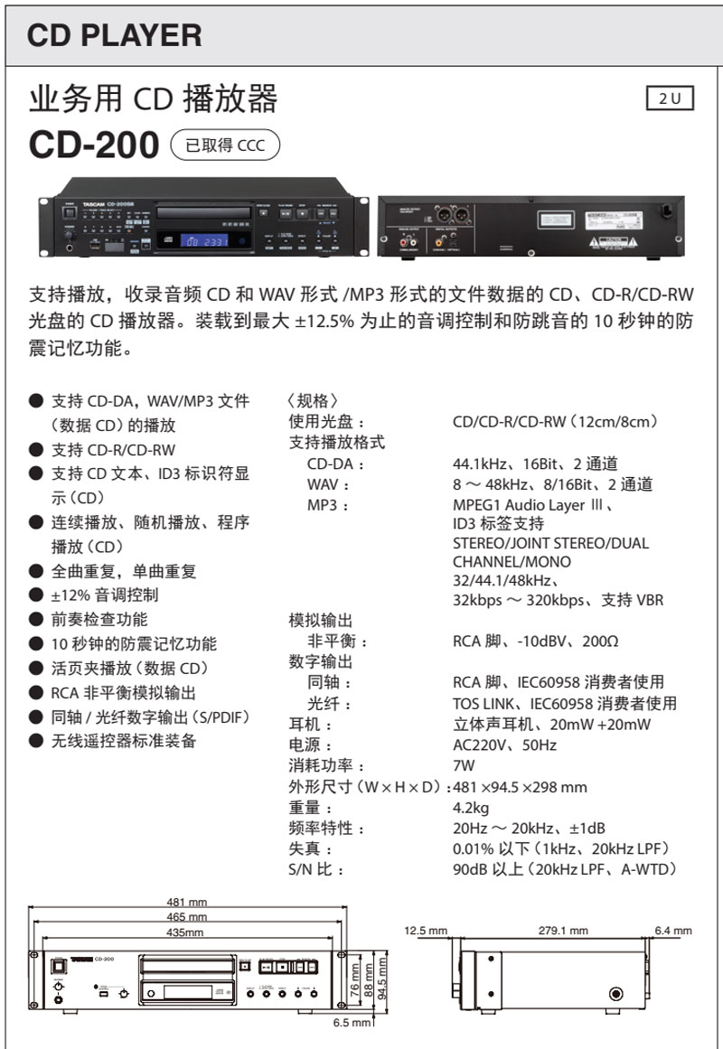 CD-200系列全部搭载本公司生产的音 频专用CD驱动器。搭载本公司开发的驱动器,实现了非常高的可靠性。