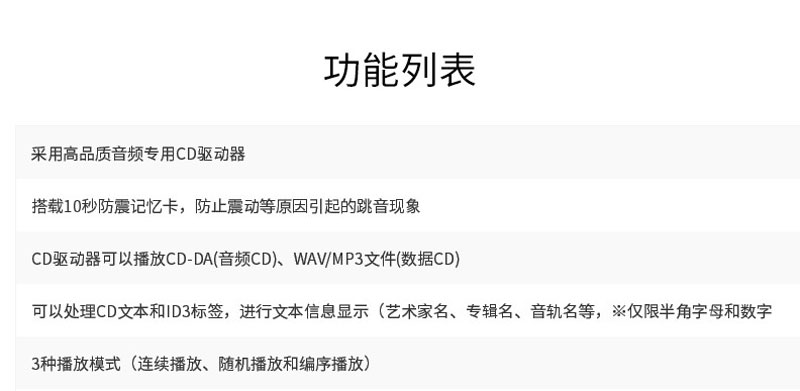 可以处理CD文本和ID3标签,进行文本信息显示(艺术家名、专辑名、音轨名等,※仅限半角字母和数字