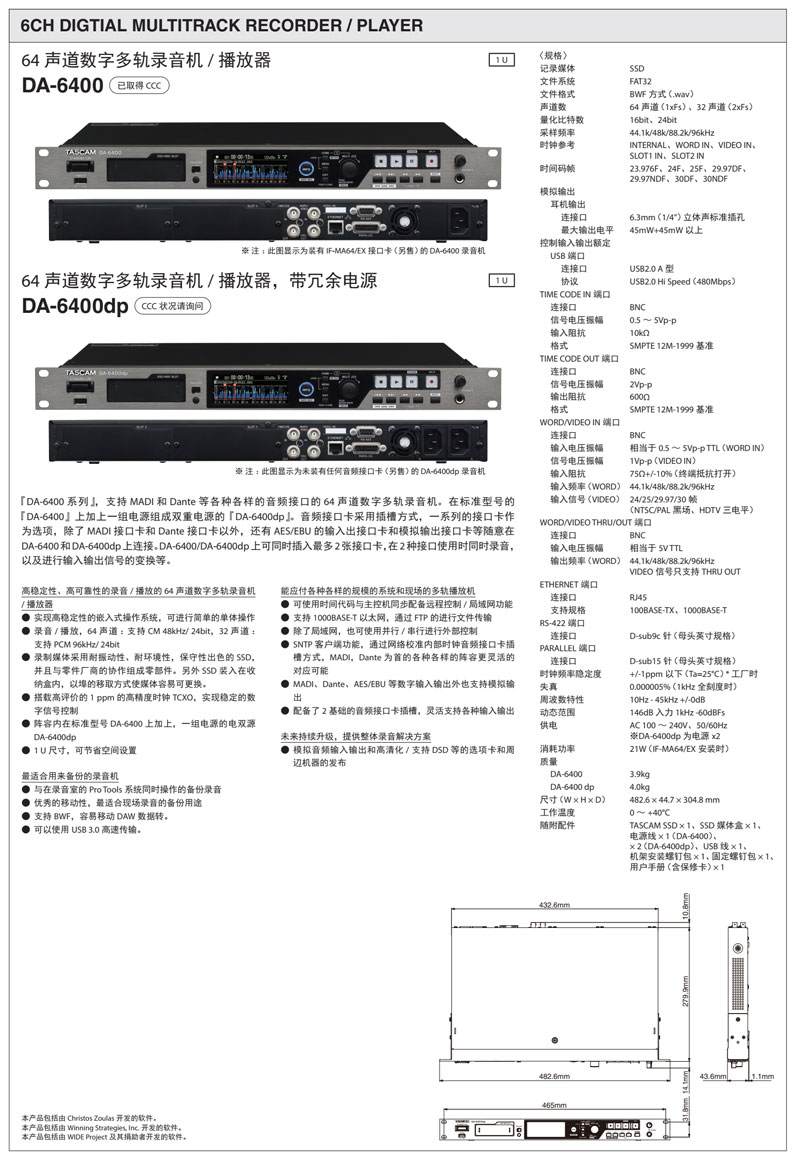 本设备采用固态硬盘(SSD),它具有优秀的抗震性和耐环境性,而且简单,无需维护操作。包含了一个TASCAM SSD , 这个通过使用DA-6400设备来进行设计和全面测试。组成部件–包括IC 控制元件,都是通过与零部件厂商合作,精心挑选并持续不断地逐批检 测以维持质量规格。