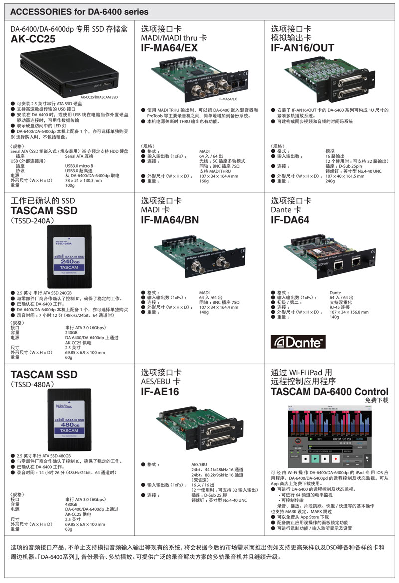 注: 每个DA-6400/DA-6400dp设备都包含有一个AK-CC25和一个TASCAM SSD。额外的盒子和驱动器均需单独购买。