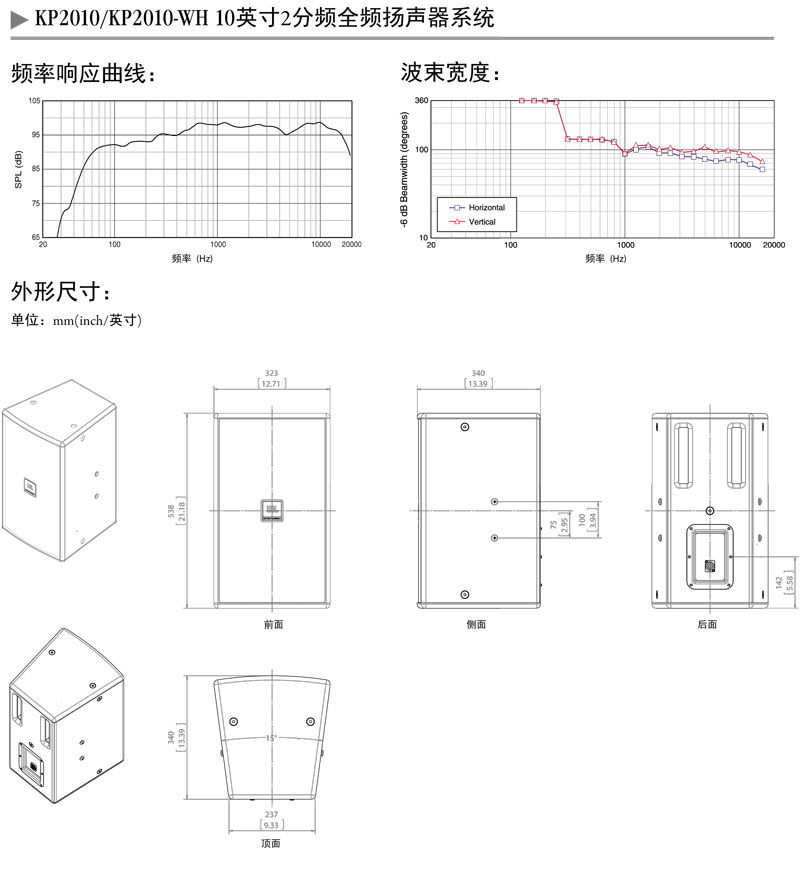 KP2010是一款紧凑,高输出且性能优越的全频扬声器。它配备了一只精心设计的口径254mm(10英寸)的大功率、低失真及低功率压缩的低音单元,内置经优化设计的解调/散热铝短路环;一个型号为2414H-C,口径25mm(1英寸)的环形聚乙烯振膜及钕铁硼磁钢的压缩高音单元。整个音箱系统可承受300W的输入功率,无论水平或垂直摆放,70 ° x 100 °覆盖角都可以提供均匀平坦的覆盖范围。高阶无源分频设计,最大限度减少了频率重叠。