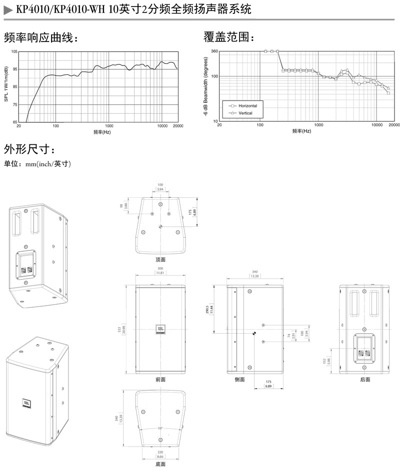 KP4010是一款紧凑,高输出且性能优越的全频扬声器。它配备了一只精心设计的口径254mm(10英寸)的大功率、低失真及低功率压缩的低音单元,内置经优化设计的解调/散热铝短路环;一个型号为2408H-2,口径37.5mm(1.5英寸)的环形聚乙烯振膜及钕铁硼磁钢的压缩高音元。整个音箱系统可承受300W的输入功率,无论水平或垂直摆放,70 ° x 100 °覆盖角都可以提供均匀平坦的覆盖范围。高阶无源分频设计,最大限度减少了频率重叠。