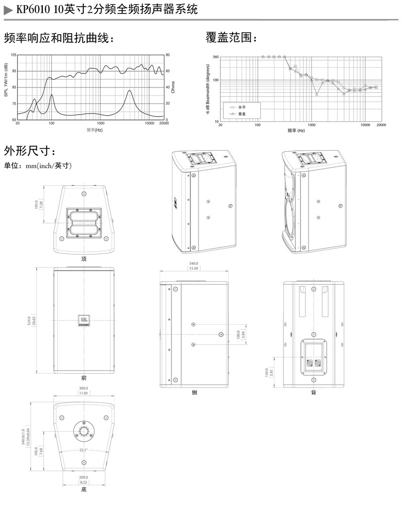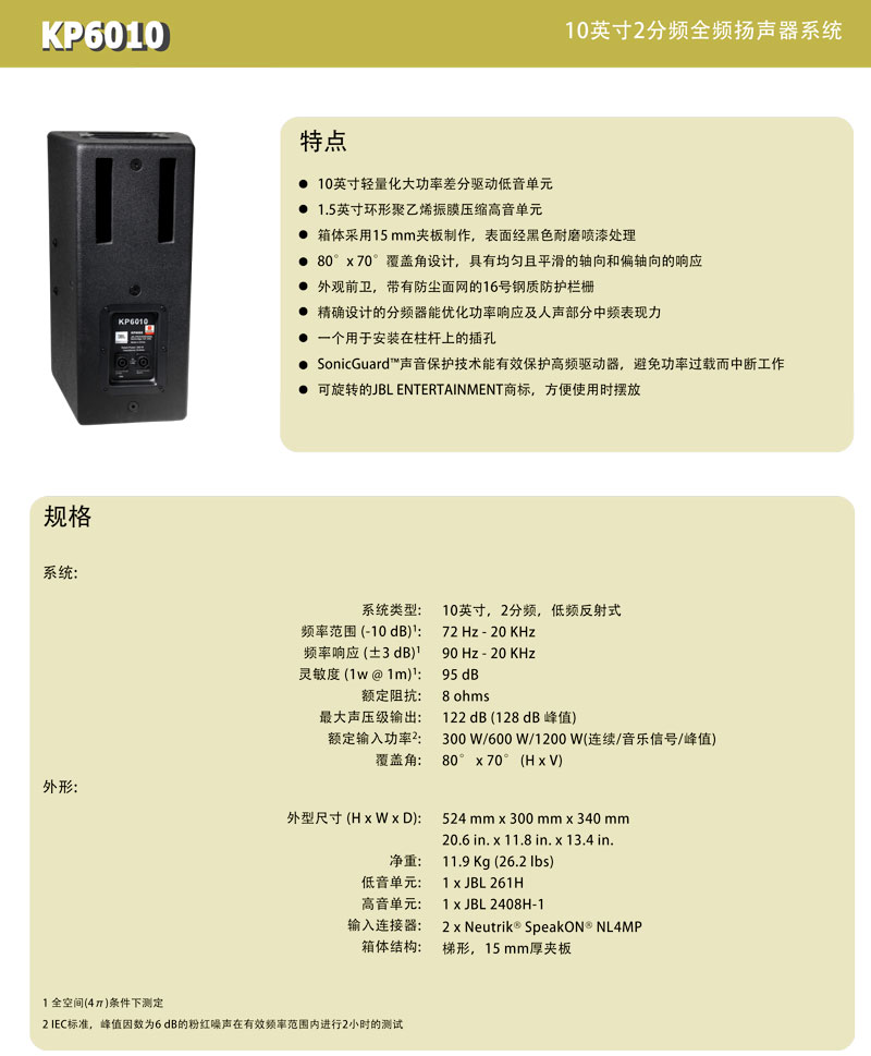 KP6010是一款轻质、高输出且性能优越的全频扬声器。它配备了一个型号为261H,口径254 mm(10英寸)的差分驱动低音单元;一个型号为2408H-1,口径37.5 mm(1.5英寸)的环形聚乙烯振膜及钕铁硼磁钢的压缩高音单元。整个音箱系统可承受300W的输入功率。无论水平或垂直摆放,80°x 70°覆盖角都可提供均匀平坦的覆盖范围。高斜率衰减的无源分频器能最大限度地减少频段重叠。