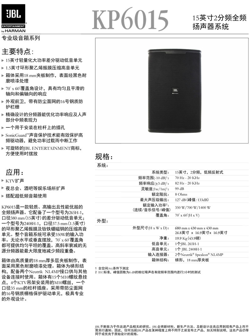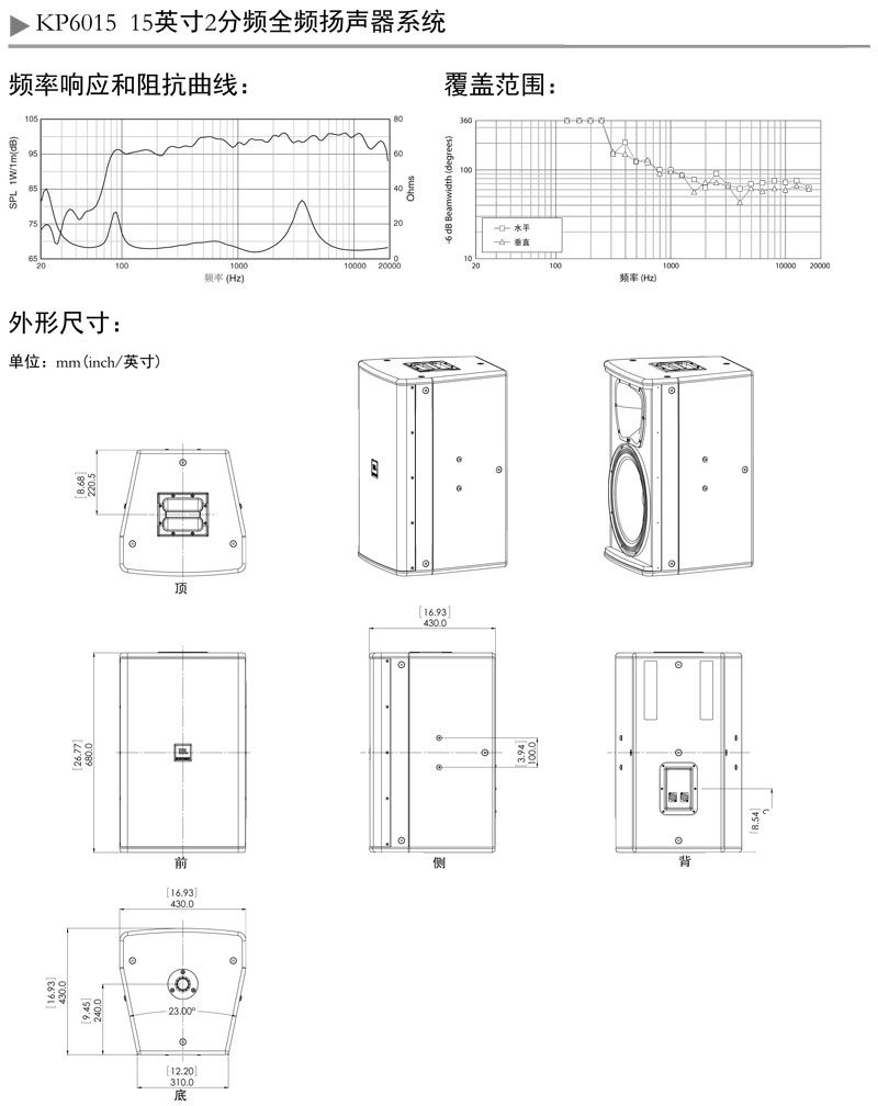KP6015是一款轻质、高输出且性能优越的全频扬声器。它配备了一个型号为265H-1,口径380 mm(15英寸)的差分驱动低音单元;一个型号为2408H-1,口径37.5 mm(1.5英寸)的环形聚乙烯振膜及钕铁硼磁钢的压缩高音单元。整个音箱系统可承受350W的输入功率。无论水平或垂直摆放,70° x 60°覆盖角都可提供均匀平坦的覆盖。高斜率衰减的无源分频器能最大限度地减少频段重叠。