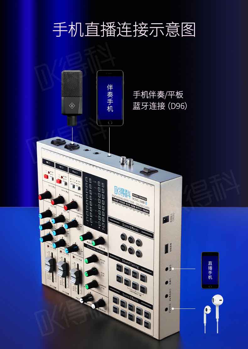 DK/得科 DK396B调音台加520大振膜麦克套装 直播调音台麦克风 手机K歌直播声卡 得科手机声卡音频直播设备