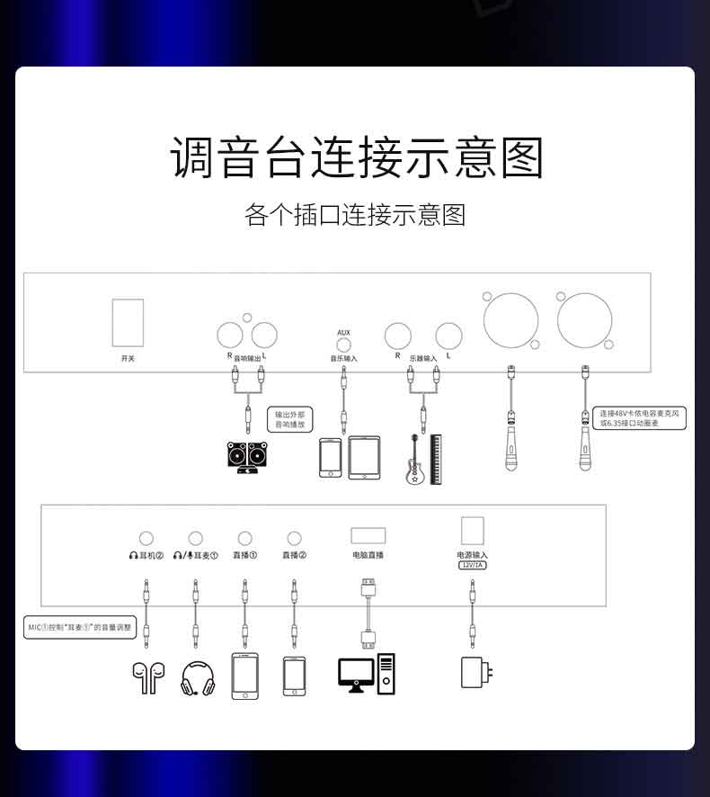 12,内置48V幻象电源,6.5输入接口,连接轻松简便!