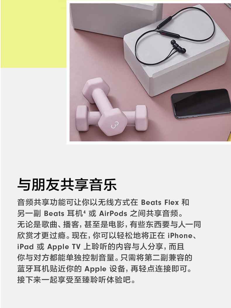 音频共享功能可让你以无线方式,在 Beats Flex 和另一副 Beats 耳机2 或 AirPods 之间分享歌曲、播客或电影等音频内容
