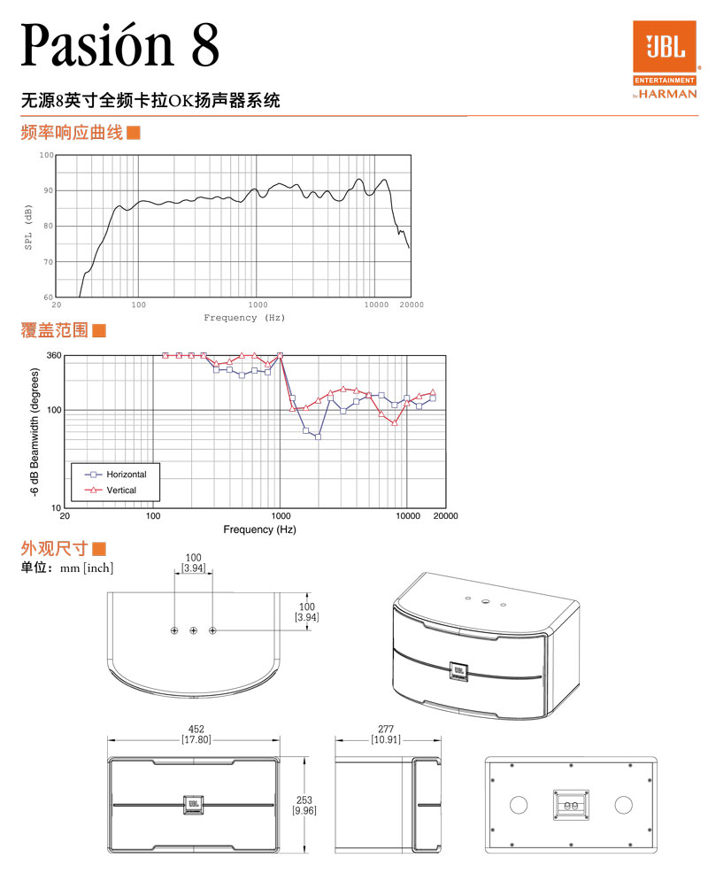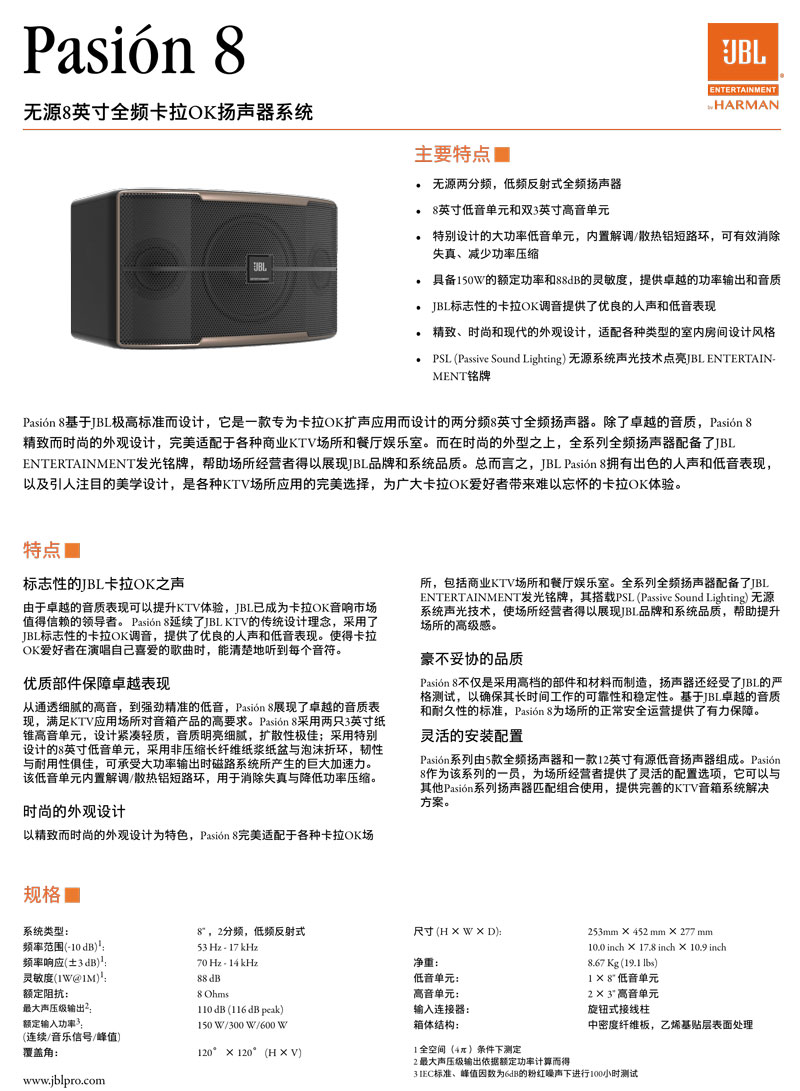 Pasión 8基于JBL极高标准而设计,它是一款专为卡拉OK扩声应用而设计的两分频8英寸全频扬声器。除了卓越的音质,Pasión 8精致而时尚的外观设计,完美适配于各种商业KTV场所和餐厅娱乐室。而在时尚的外型之上,全系列全频扬声器配备了JBL ENTERTAINMENT发光铭牌,帮助场所经营者得以展现JBL品牌和系统品质。总而言之,JBL Pasión 8拥有出色的人声和低音表现,以及引人注目的美学设计,是各种KTV场所应用的完美选择,为广大卡拉OK爱好者带来难以忘怀的卡拉OK体验。