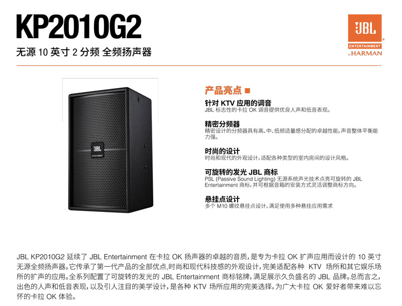JBL KP2010G2 延续了 JBL Entertainment 在卡拉 OK 扬声器的卓越的音质,是专为卡拉 OK 扩声应用而设计的 10 英寸无源全频扬声器。它传承了第一代产品的全部优点,时尚和现代科技感的外观设计,完美适配各种 KTV 场所和其它娱乐场所的扩声的应用。全系列配置了可旋转的发光的 JBL Entertainment 商标铭牌,满足展示久负盛名的 JBL 品牌。总而言之,