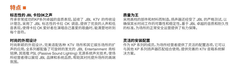 传承非常成功的KP系列卓越的音质表现,延续了 JBL KTV 的传统设计理念,采用了 JBL 标志性的卡拉 OK 调音,提供了优良的人声和低音表现。使得卡拉 OK 爱好者在演唱自己喜爱的歌曲时,能清楚地听到每个音符。