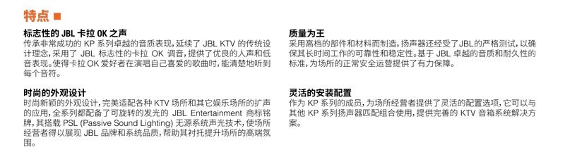 传承非常成功的 KP 系列卓越的音质表现,延续了 JBL KTV 的传统设计理念,采用了 JBL 标志性的卡拉 OK 调音,提供了优良的人声和低音表现。使得卡拉 OK 爱好者在演唱自己喜爱的歌曲时,能清楚地听到每个音符。
