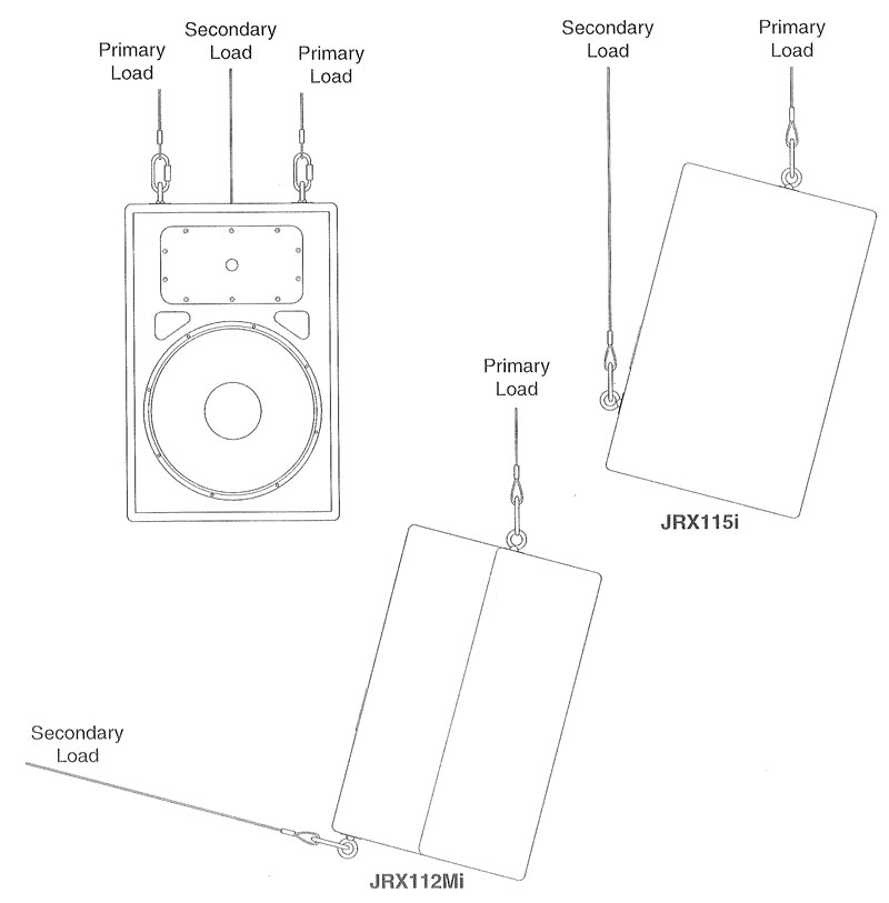 JRX115i 是一种固定安装的扬声器系统。3 个 M10 眼圈螺栓和线缆托架替代了便携式 JRX115 的脚、柱杆插座和手柄。